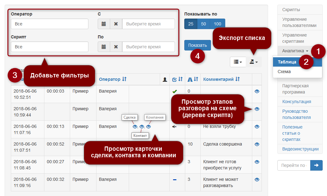 Статистика прохождения скрипта - результат, шаги и комментарий автоматически в карточке CRM.