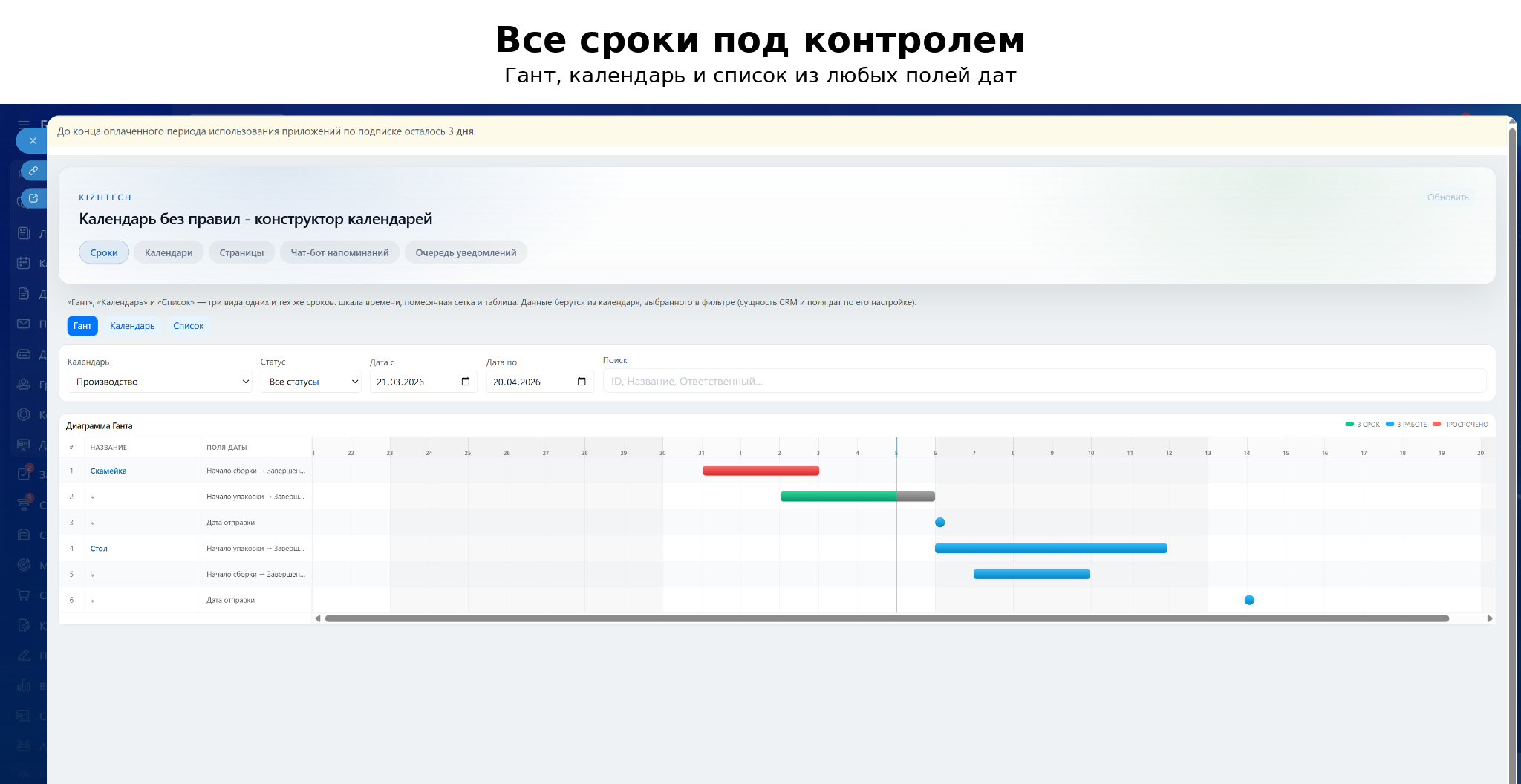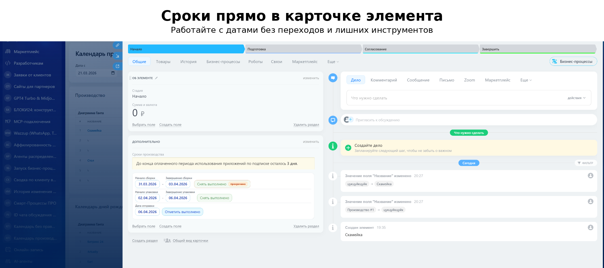 Приложение помогает контролировать сроки по любым элементам, опираясь на уже существующие поля дат в карточках (сделки, лиды, контакты, компании, смарт-процессы).