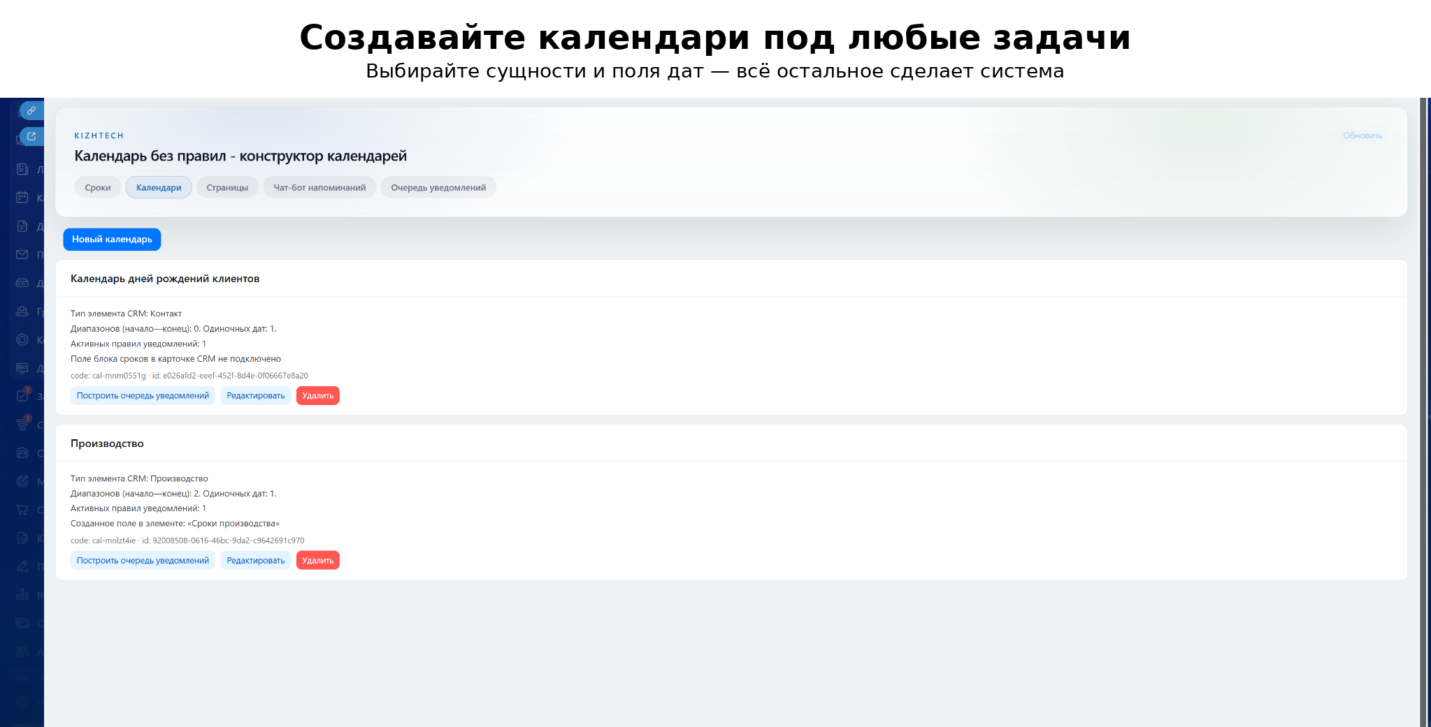 - Календари-сборки — вы выбираете сущность и нужные поля дат (в том числе диапазоны «начало—конец»); данные подтягиваются с портала.