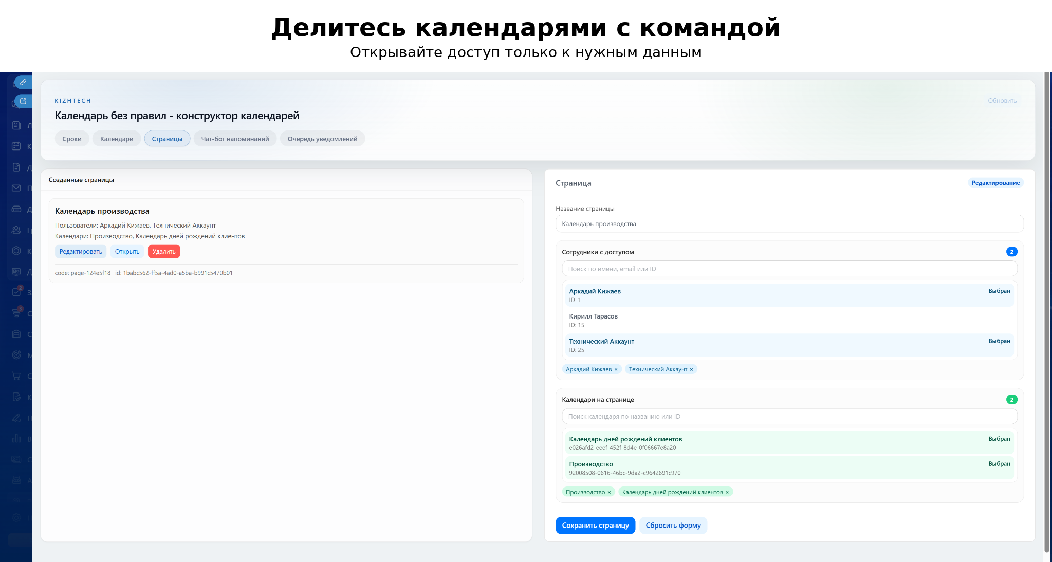 - Отдельные страницы — можно собрать выборку календарей и открыть её выбранным сотрудникам без доступа ко всем настройкам приложения.