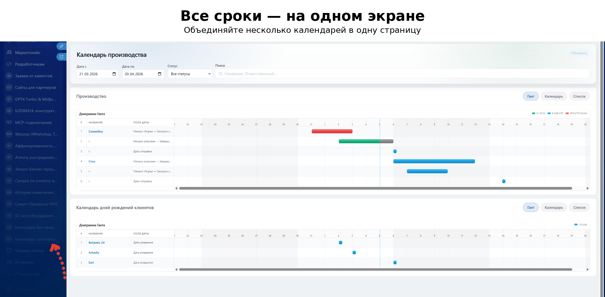 - Фильтры по датам, статусу срока, поиск по названию, ID, ответственному и др.