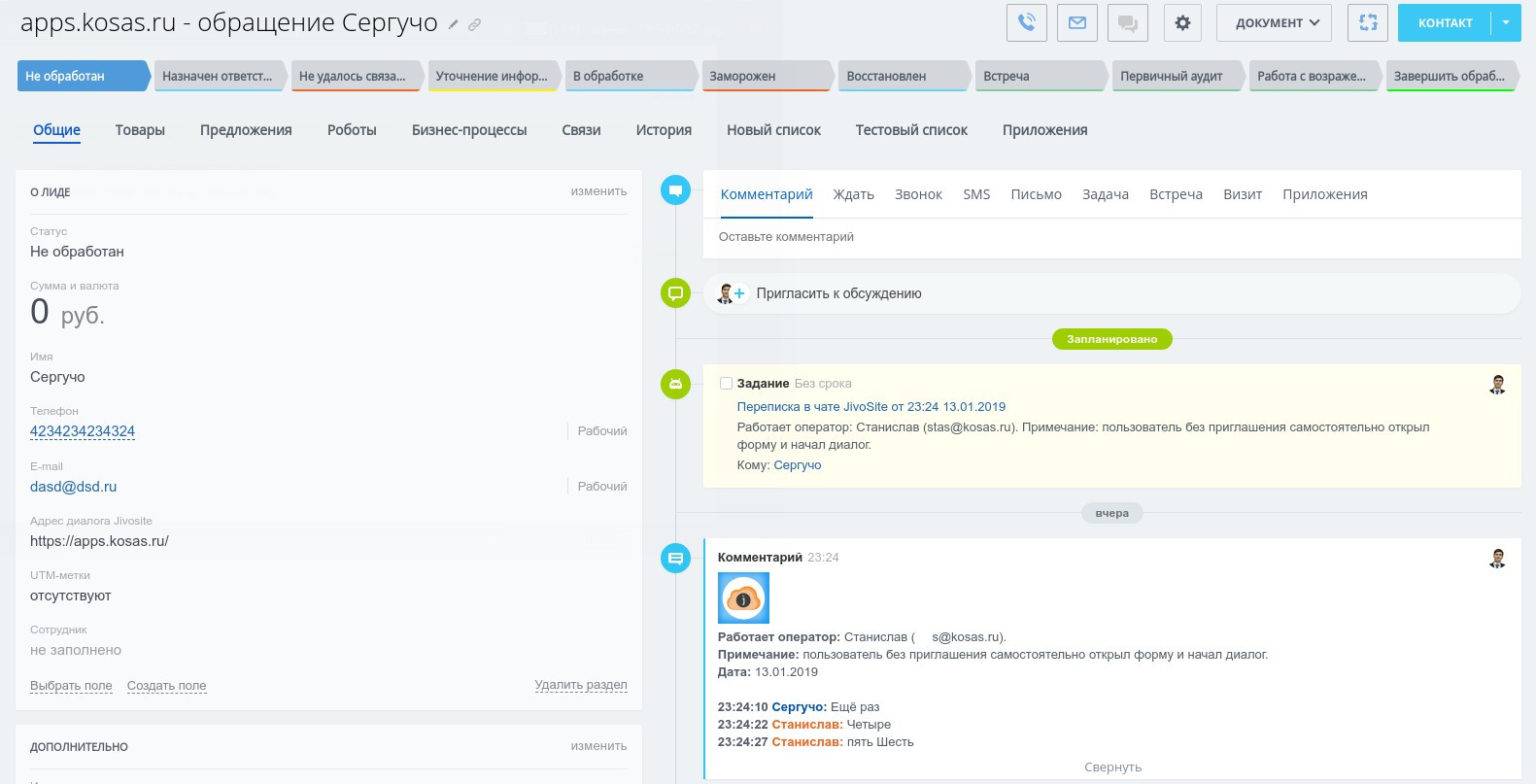 - Наше приложение разрабатывалось с логикой, в которой подразумевается, что каждый обратившийся клиент должен иметь персональную почту и телефон. Если Вам пишут разные люди с одним адресом e-mail или телефоном (корпоративный телефон или e-mail), то такую ситуацию у нас пока нет возможности разрешать (диалог будет заносится в один Лид или Контакт).