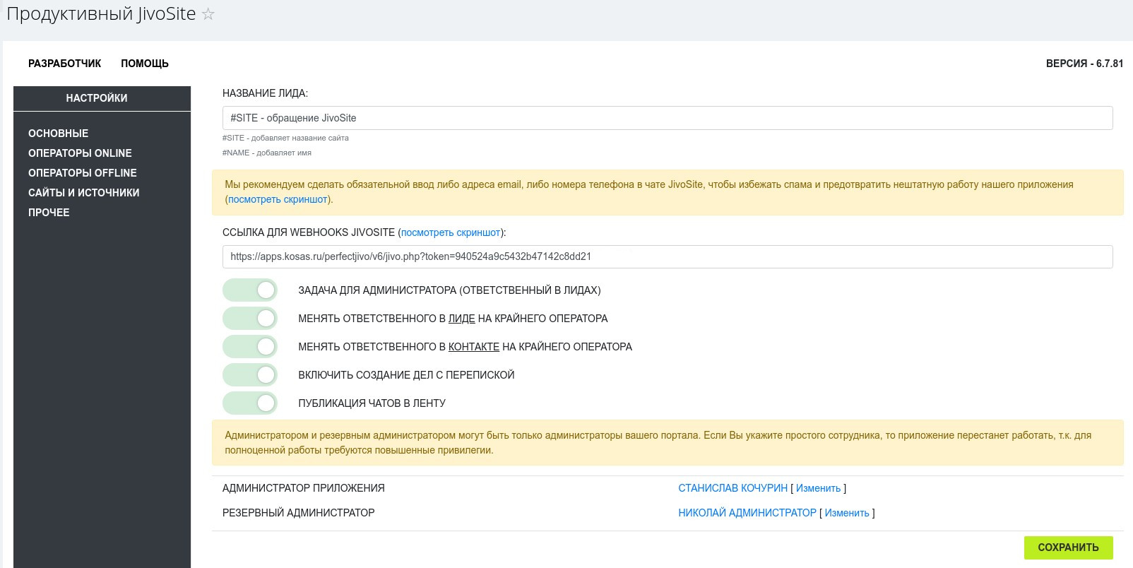 - Если Администратор приложения "и швец, и жнец, и на дуде игрец" (он и админ, и оператор, и ответственный в одном лице), то рекомендуем отключить опцию "Задачи для администратора (ответственный в Лидах)"