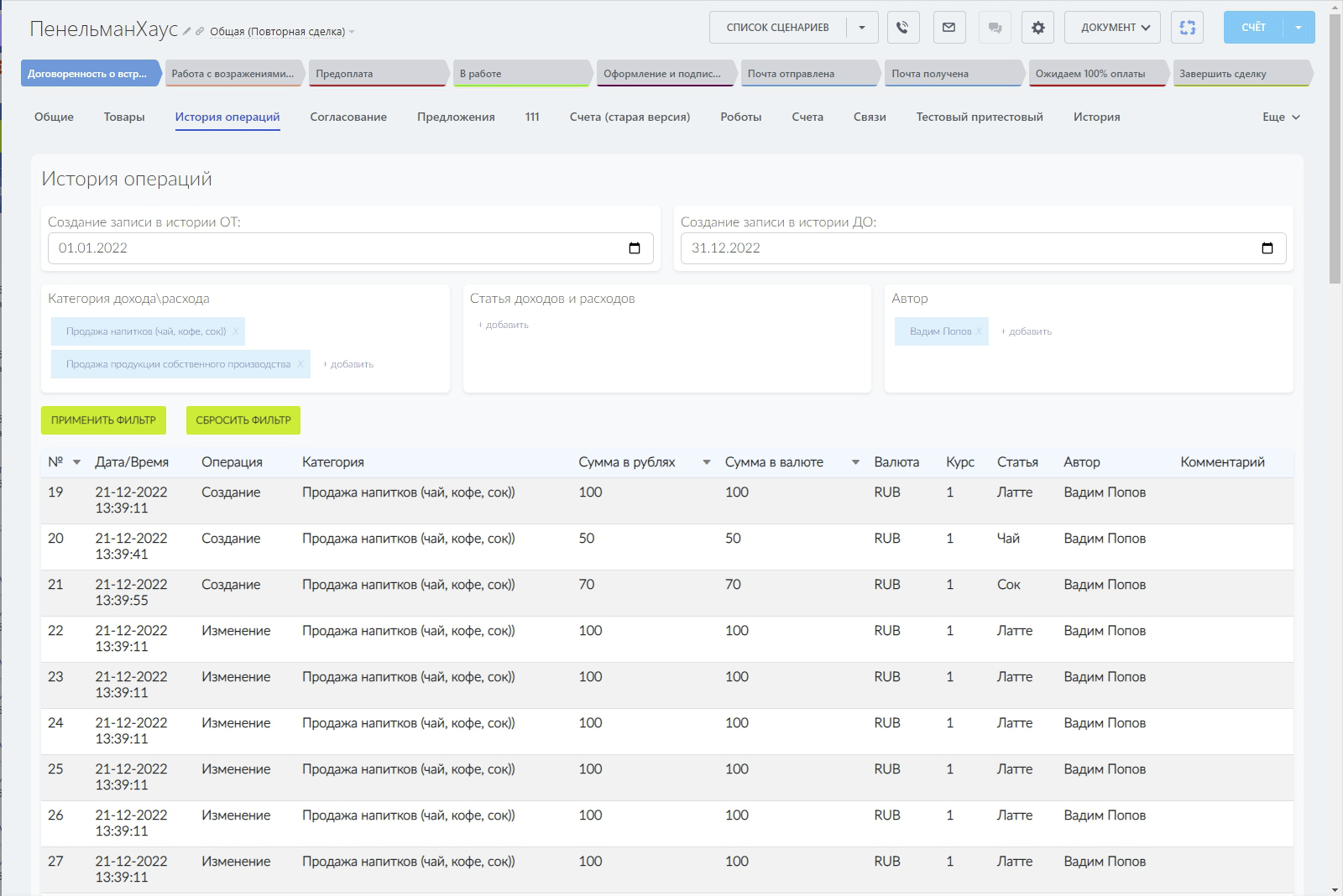Финансовый отчет можно изучить в разные периоды времени, по каждой сделке индивидуально, либо по всем сделкам, которые привязаны к Компании.Если финансовый отчет по каким-то причинам не сходится с ожидаемым, или какие-то из записей доходов/расходов отсутствуют, то всегда можно проверить историю операций, и историю расчетов возможно кто-то из сотрудников случайно удалил или изменил их.