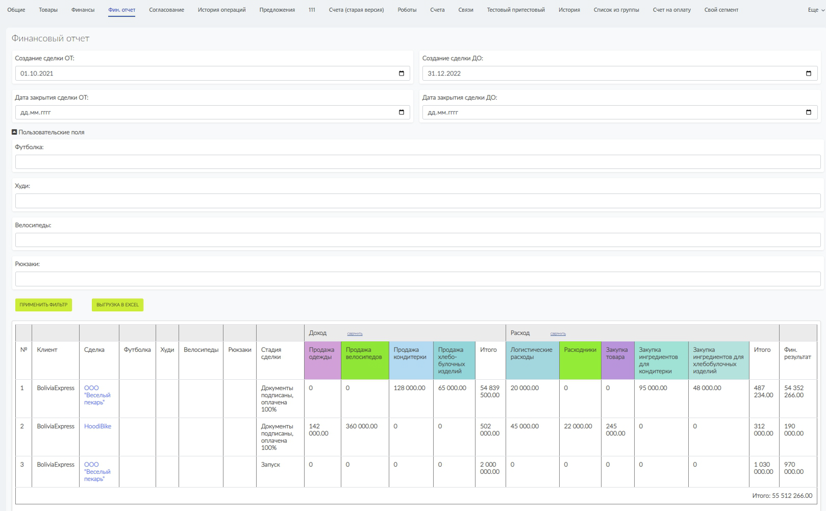 Финансовый отчет можно изучить в разные периоды времени, по каждой сделке индивидуально, либо по всем сделкам, которые привязаны к Компании.