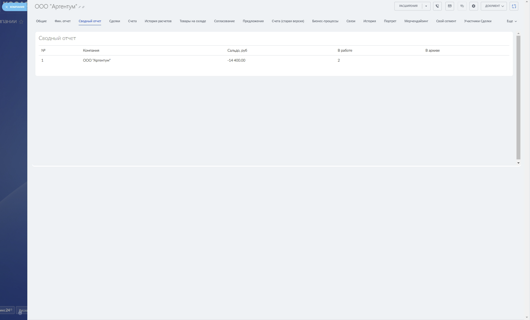 Сделать это можно перейдя во вкладку "Сводный отчет", в сущности Компания. Так же в этой вкладке отображено количество завершенных и активных сделок.