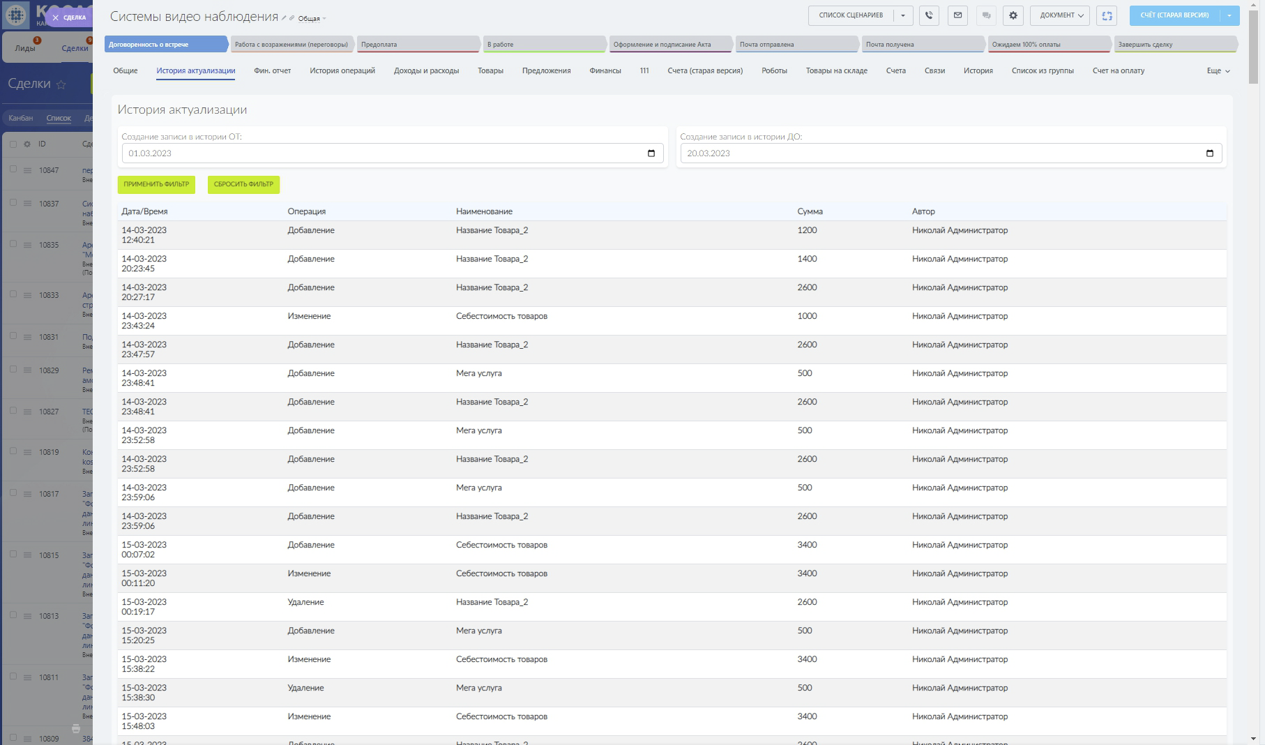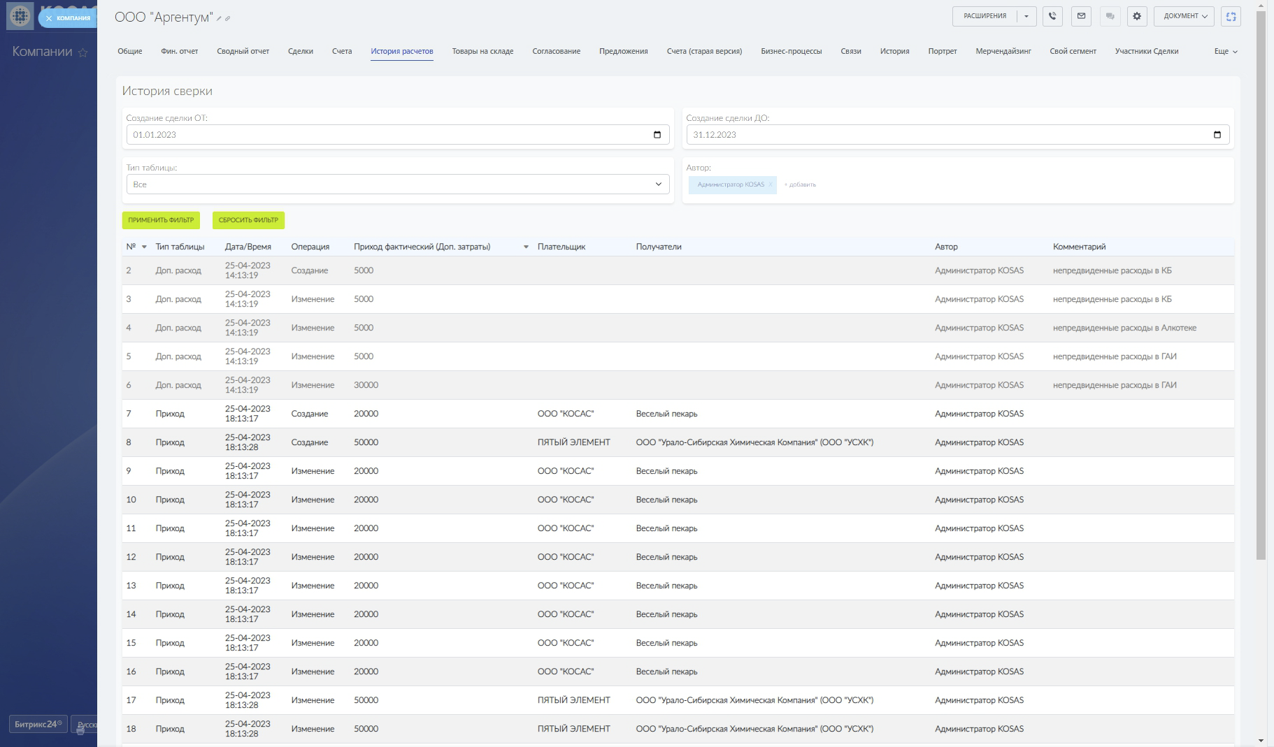 Финансовый отчет можно изучить в разные периоды времени, по каждой сделке индивидуально, либо по всем сделкам, которые привязаны к Компании.Если финансовый отчет по каким-то причинам не сходится с ожидаемым, или какие-то из записей доходов/расходов отсутствуют, то всегда можно проверить историю операций, и историю расчетов возможно кто-то из сотрудников случайно удалил или изменил их.