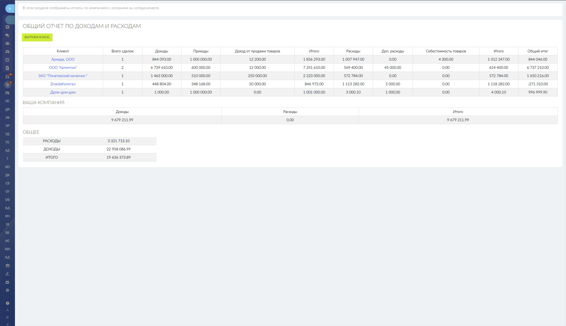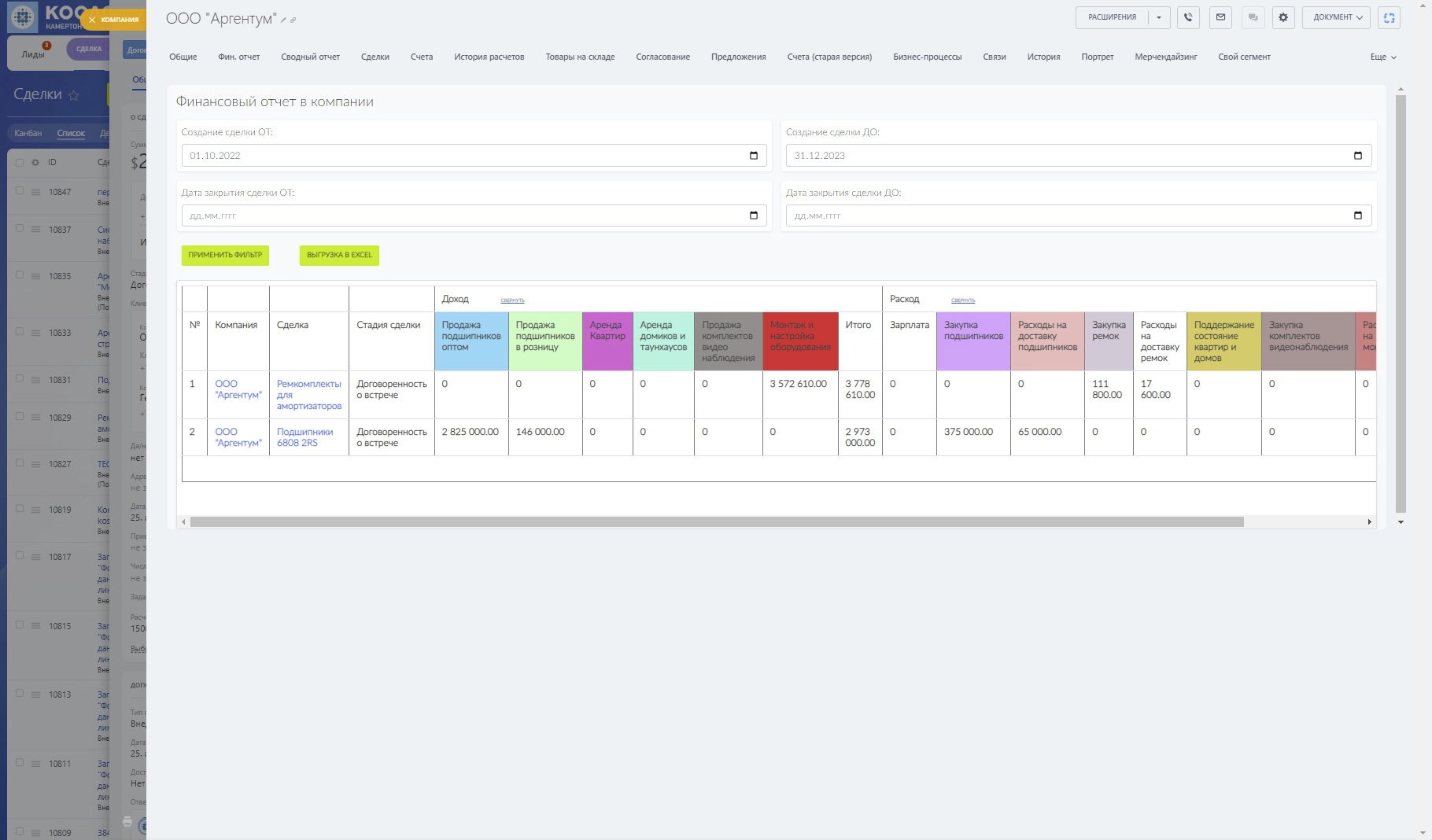 Финансовый отчет можно изучить в разные периоды времени, по каждой сделке индивидуально, либо по всем сделкам, которые привязаны к Компании.