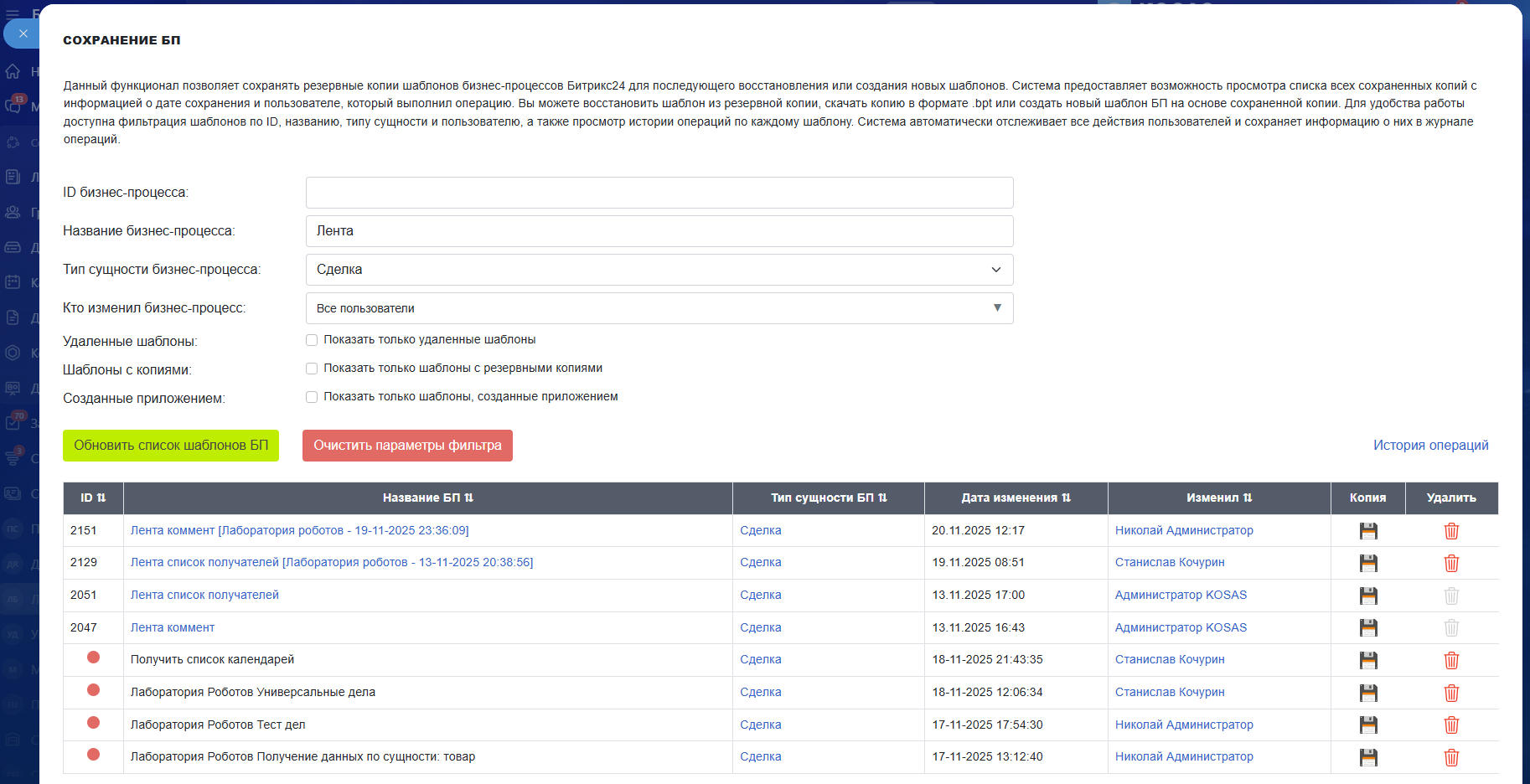 Модуль "Сохранение БП" позволяет управлять резервными копиями шаблонов бизнес-процессов. Создавайте резервные копии перед важными изменениями, восстанавливайте шаблоны после неудачных правок, скачивайте копии в формате .bpt для переноса на другие порталы. Модуль поддерживает создание новых шаблонов на основе резервных копий, работу с удаленными шаблонами и ведет полную историю всех операций.
