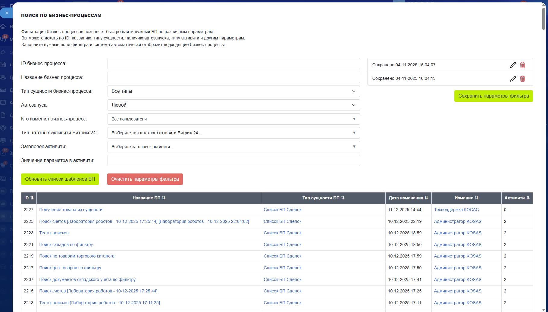 Модуль "Поиск по бизнес-процессам" обеспечивает быстрый поиск и фильтрацию шаблонов БП по множеству критериев: ID шаблона, названию, типу сущности, наличию автозапуска, типу активити, заголовку активити, значению параметра и пользователю, который изменил БП. Поддерживается сохранение до 10 наборов параметров фильтрации для быстрого доступа. Все результаты отображаются в удобной таблице с сортировкой по всем колонкам.