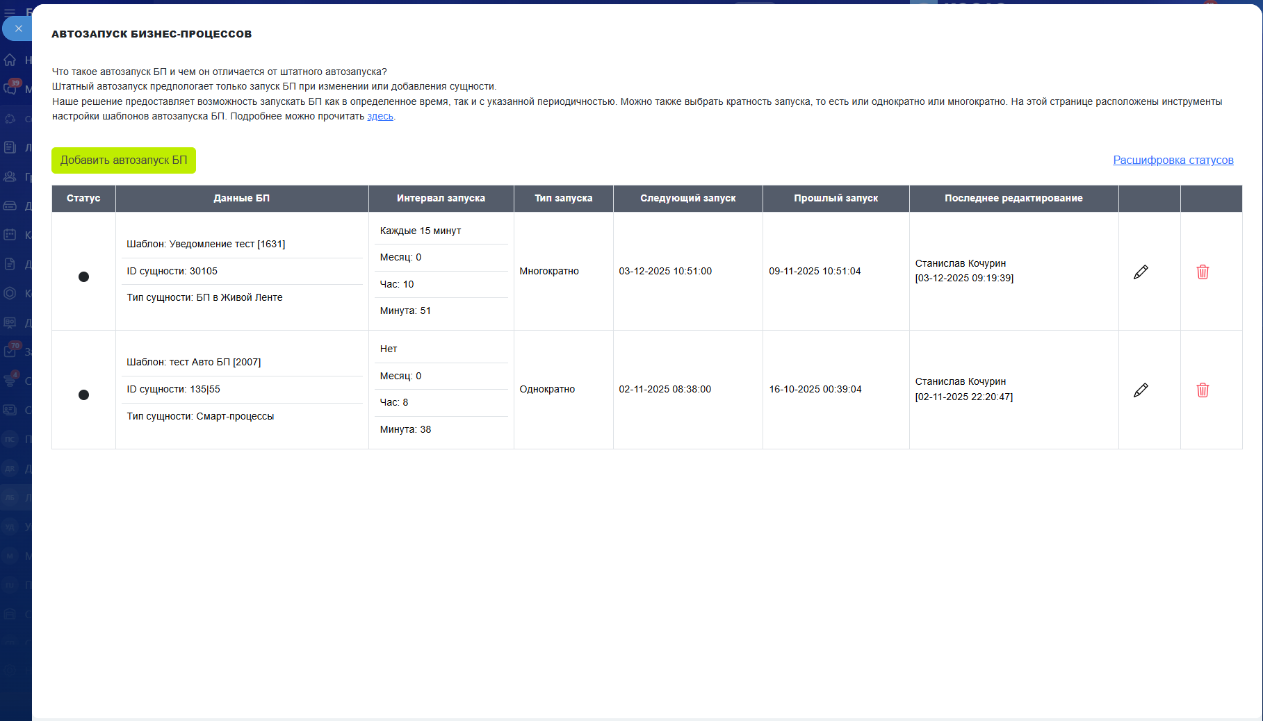 Модуль "Автозапуск Бизнес-процессов" расширяет возможности штатного автозапуска, позволяя запускать БП в определенное время или с заданной периодичностью. Настройте запуск БП на конкретное время (час, минута, месяц), выберите периодичность (каждые 15 минут, каждый час, ежедневно, еженедельно, по дням недели) и тип запуска (однократно или многократно). Модуль автоматически отслеживает расписание и запускает БП в нужное время через систему cron. Идеально для регулярных задач: ежедневные отчеты, еженедельная рассылка, ежемесячные напоминания и другие периодические операции.