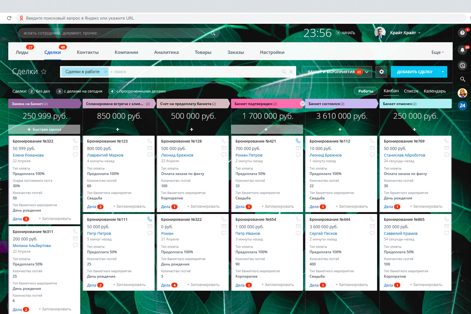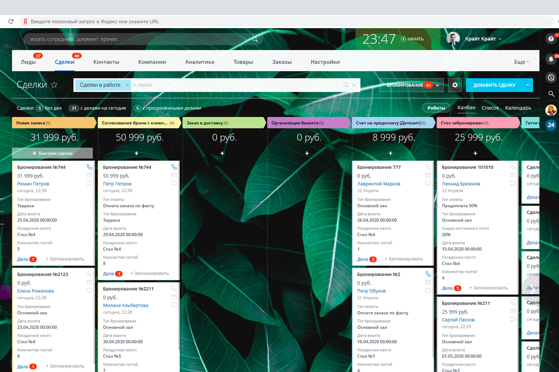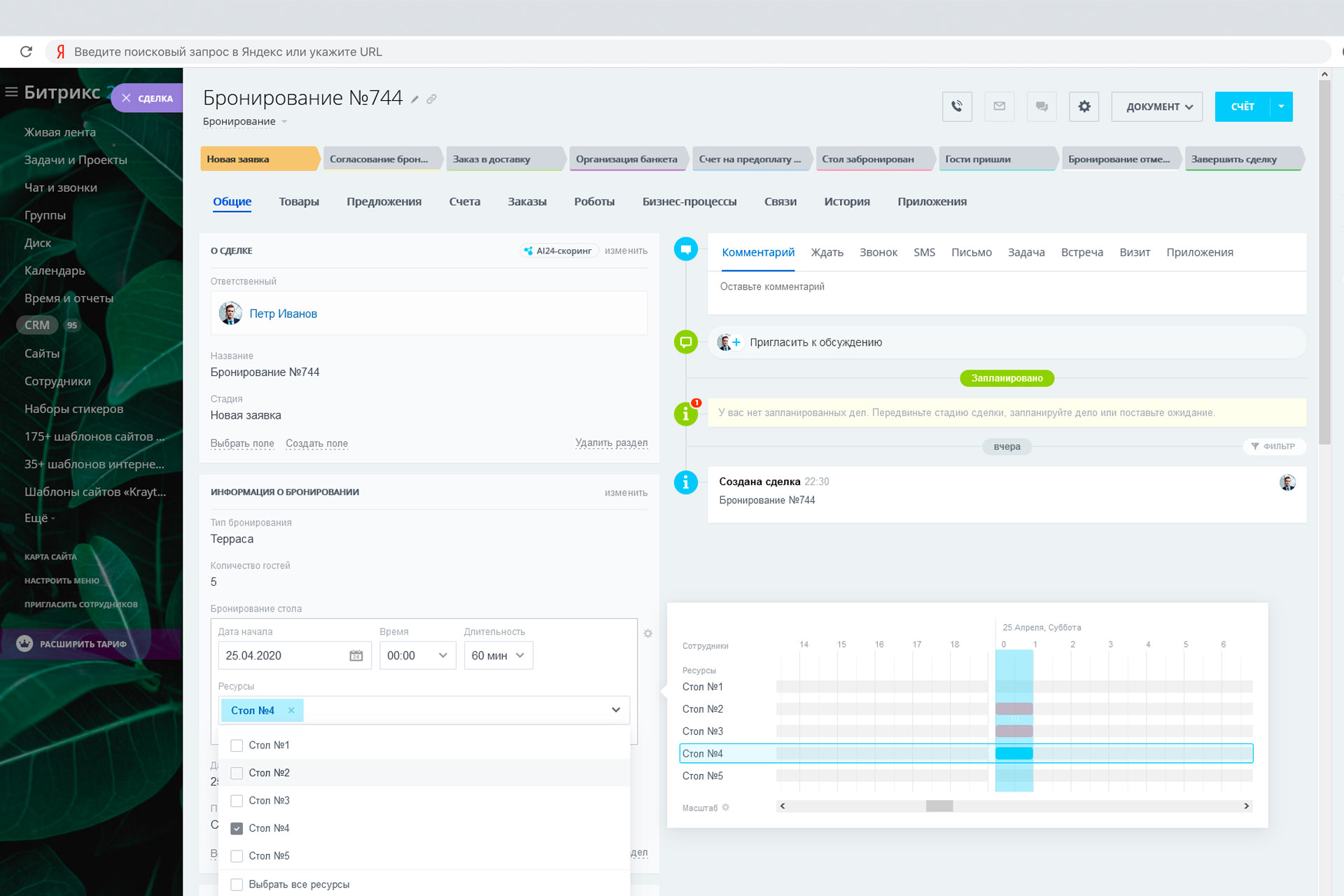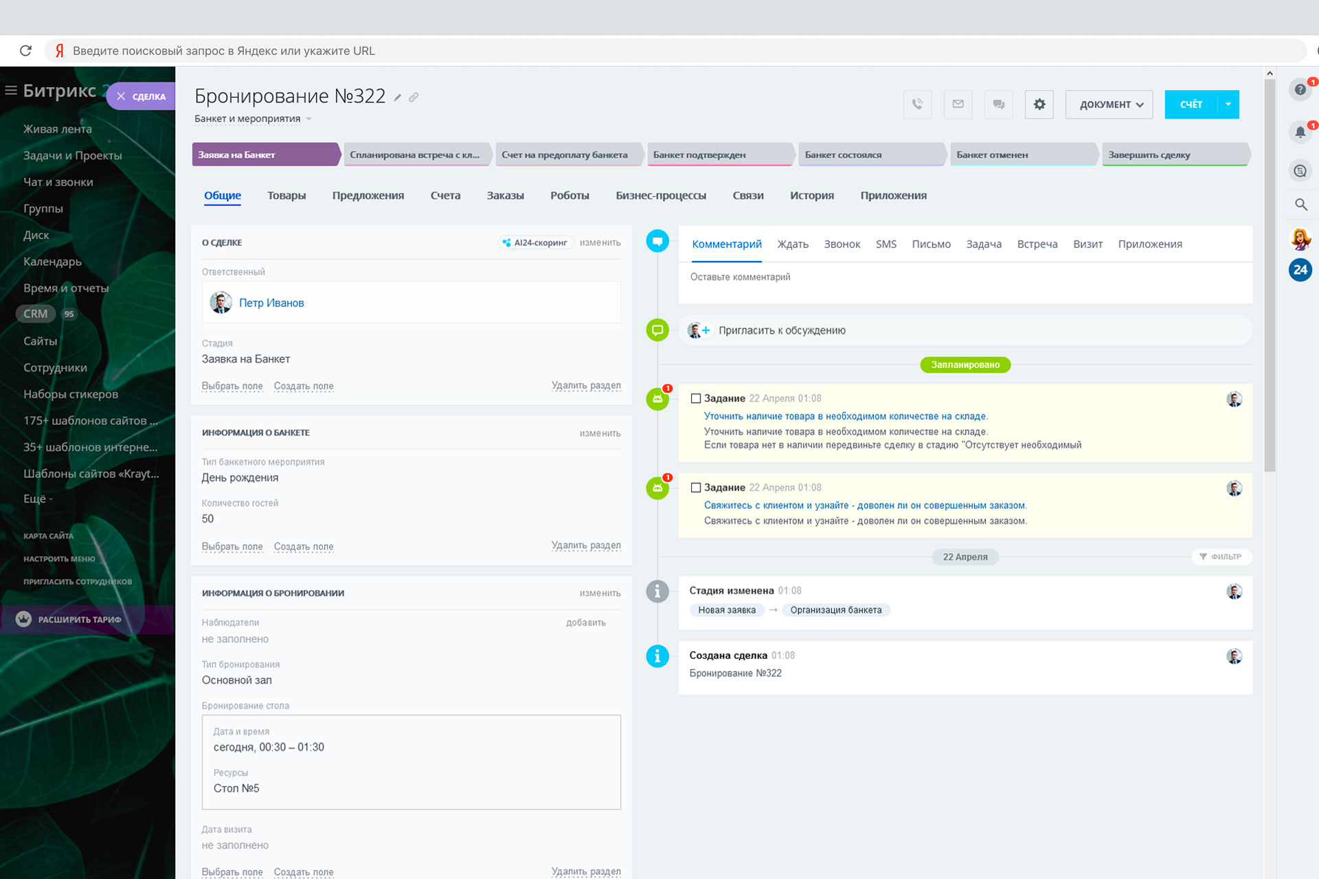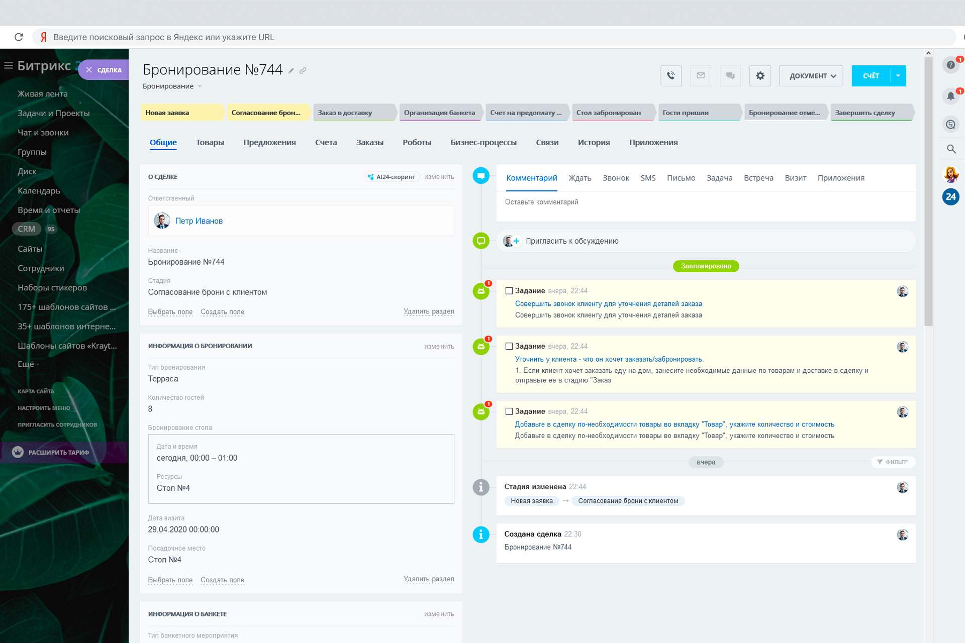 - для сделок, добавлен раздел с полями необходимыми для удобного бронирования столов: время посещения, номер столика и тд;