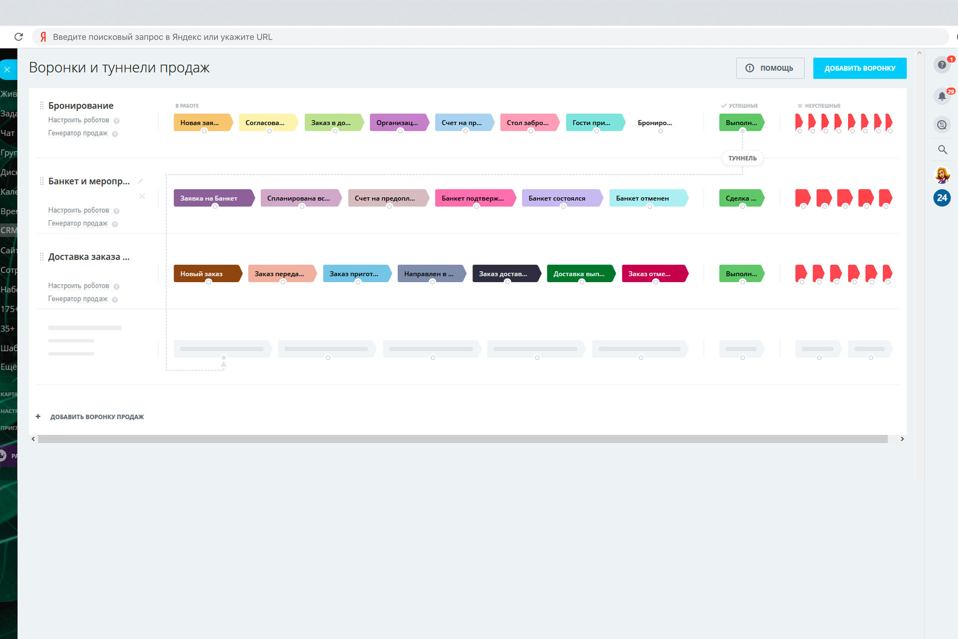 Использование разных воронок, позволят оценить эффективность работы каждого направления вашей компании по отдельности.