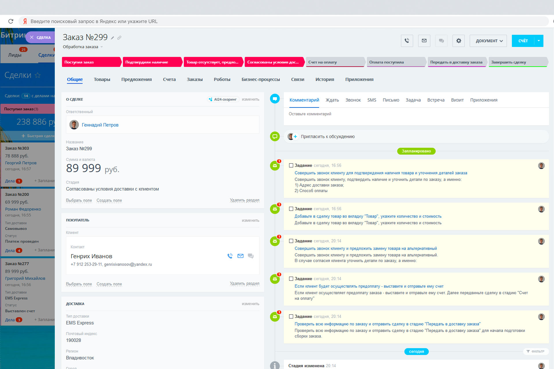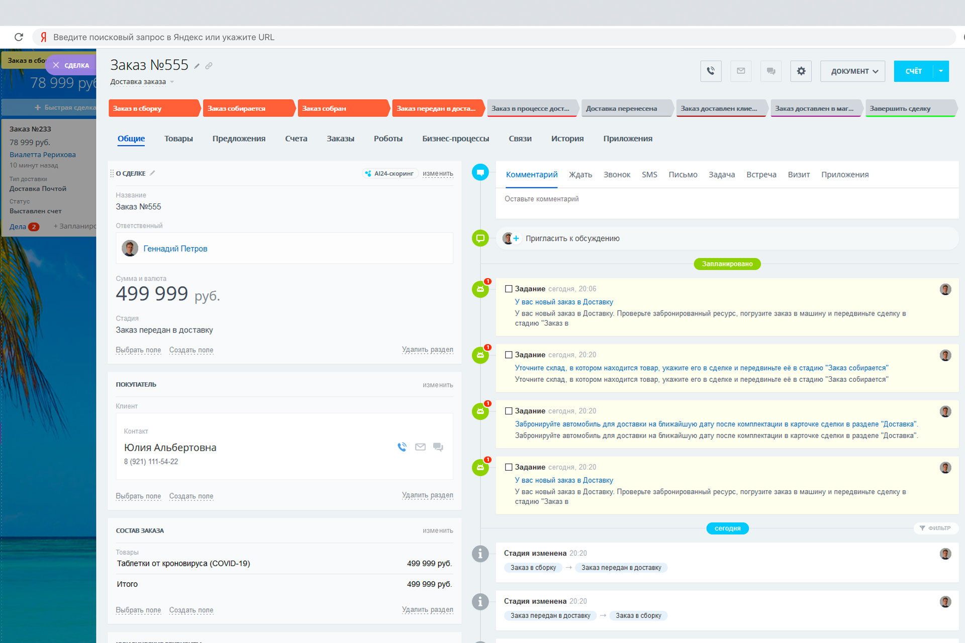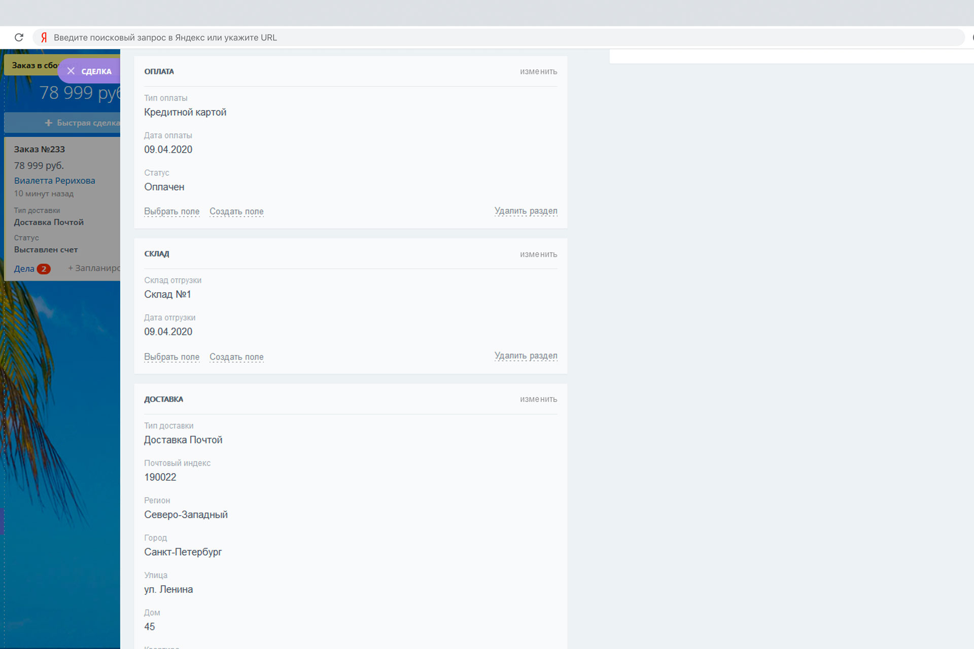 Для отлаженной работы, в отраслевой CRM были настроены поля на предмет их отображения и обязательности заполнения в зависимости свойства от стадии (для лидов и сделок). Например, менеджер не сможет отправить сделку в отдел комплектации и доставки, пока не заполнит всю необходимую информацию о доставке.