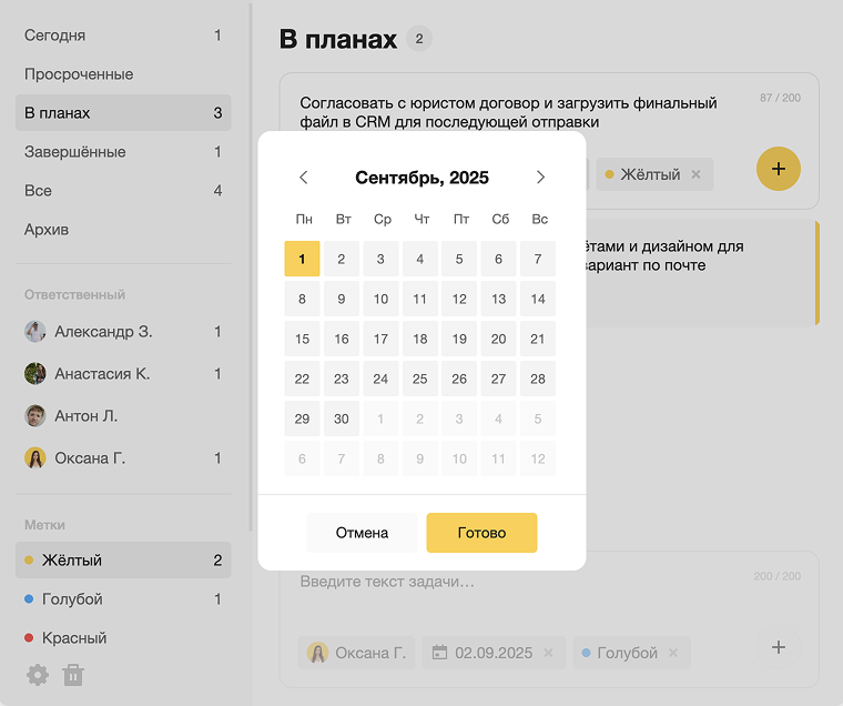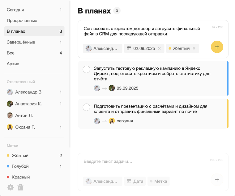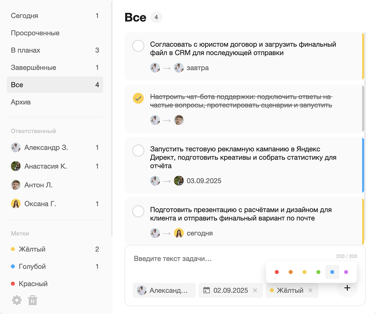 Управляйте задачами легко: изменяйте, завершайте, архивируйте и удаляйте их в пару кликов.
