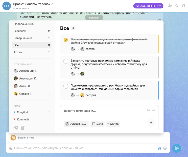 Назначайте ответственных, сроки и метки, а встроенный чат-бот напомнит о задачах.