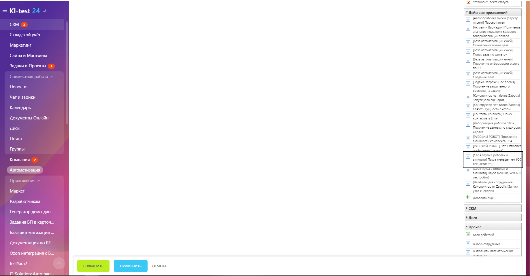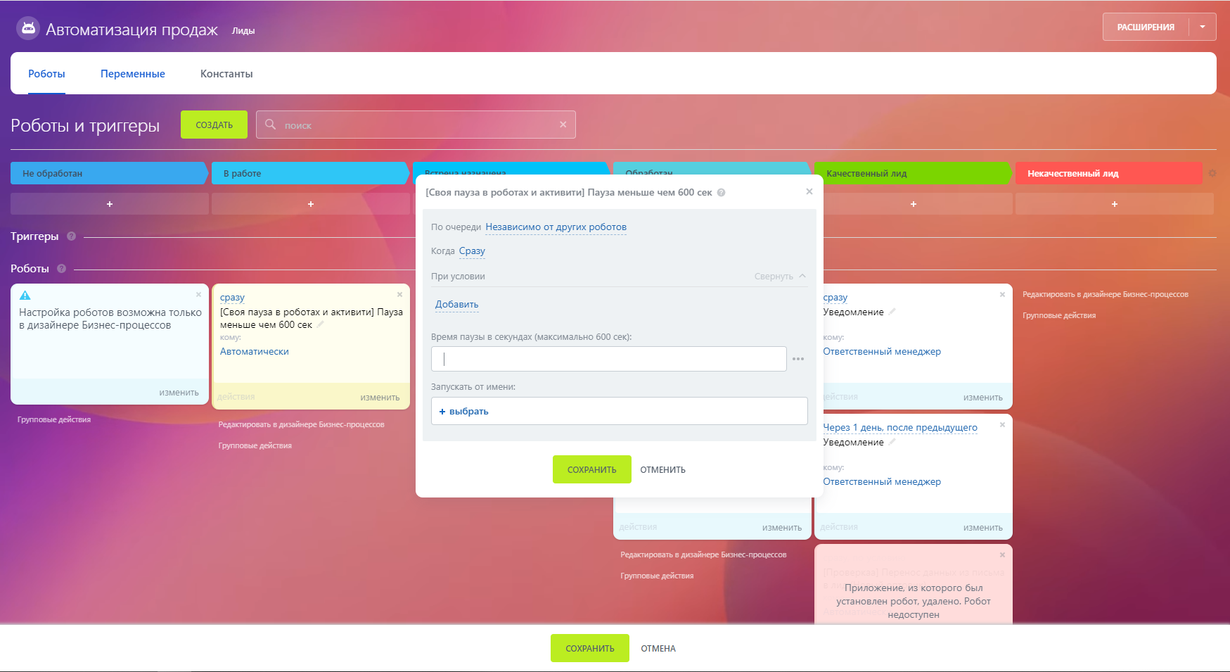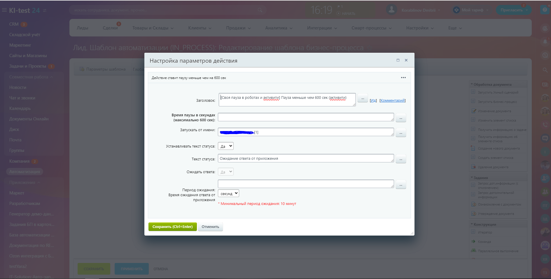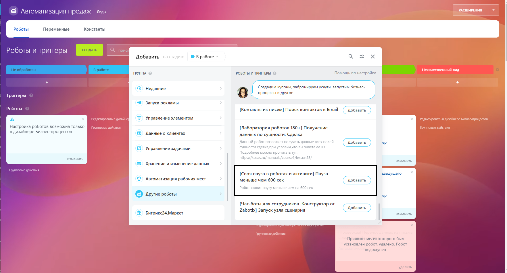 Пауза в роботах и активити от 1 до 600 секунд. Решает задачи автоматизации, когда нужна пауза, отличная от системной в 10 минут. После установки у вас появятся соответствующий робот и активити на портале. Для установки паузы в окне настройки робота или активити задайте нужное время в секундах