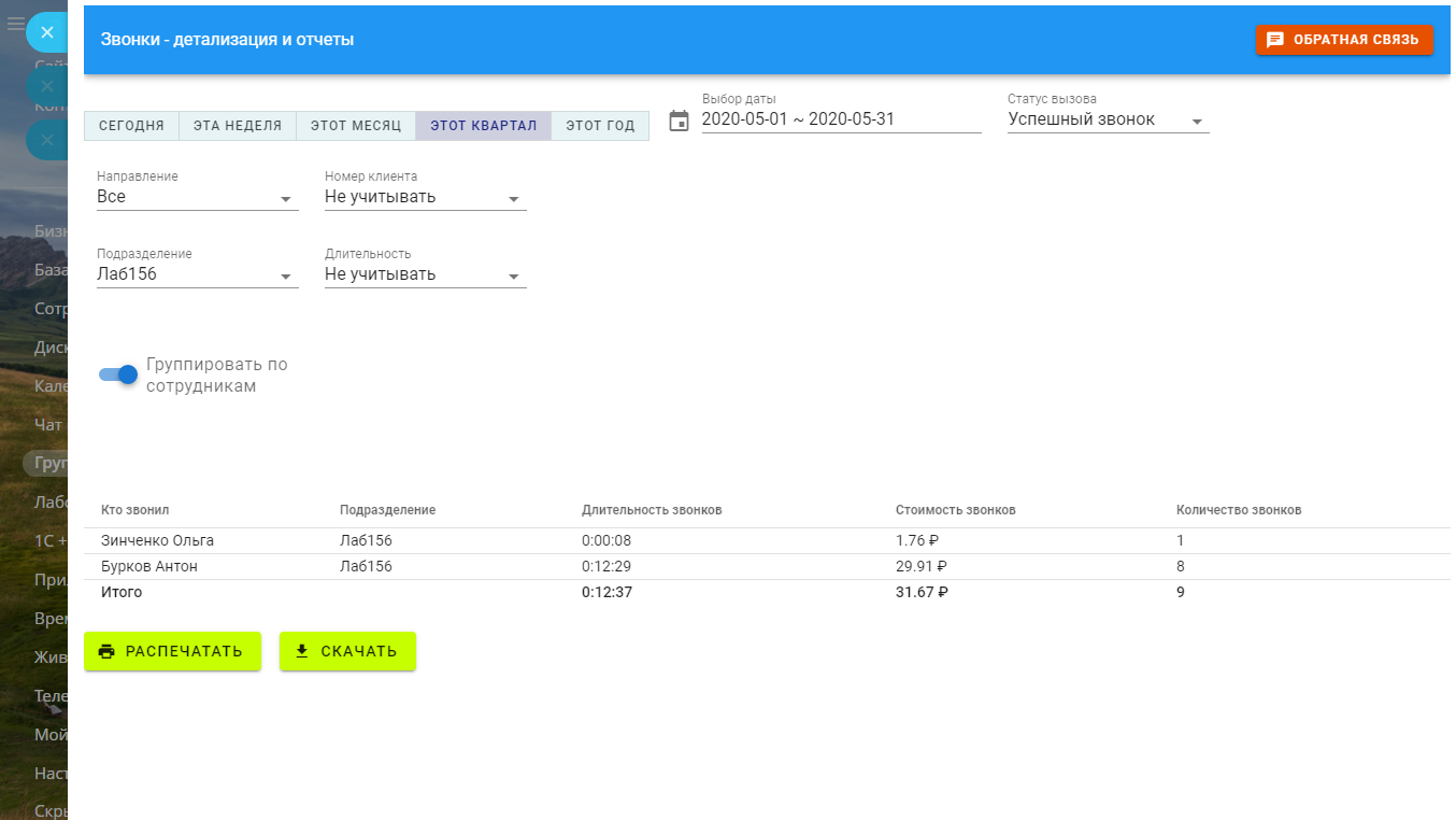 - С помощью отчета можно оценить затраты на телефонию, на сотрудника, на отдел, на компанию.