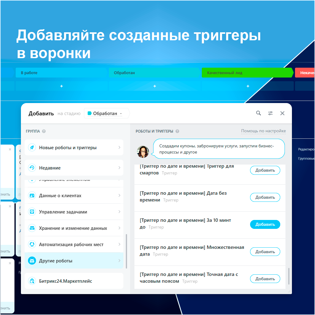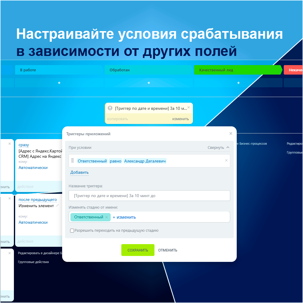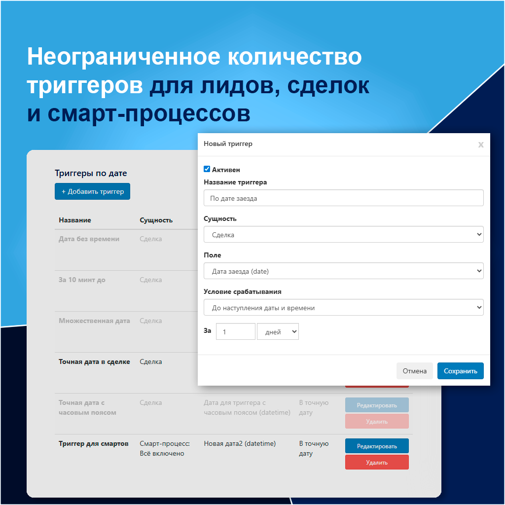 Наше приложение устраняет эти пробелы, добавляя в CRM механизм гибких триггеров, которые реагируют на изменения в реальном времени.