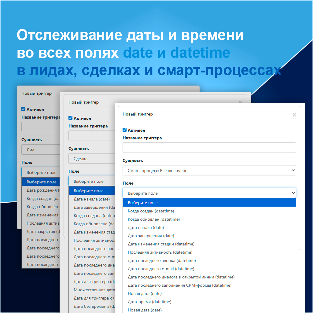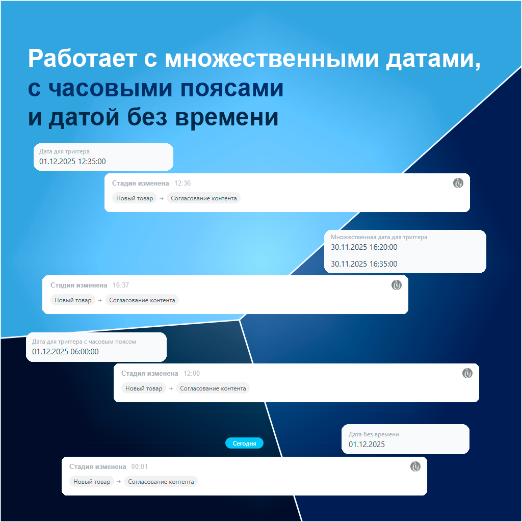 Как это работаетПриложение непрерывно отслеживает поля с датой/временем в лидах, сделках и смарт‑процессах. При наступлении заданного условия триггер срабатывает и переключает элемент в нужную стадию — без привязки к тому, на какой стадии элемент находился до этого и когда была заполнена или изменена дата в соответствующем поле.