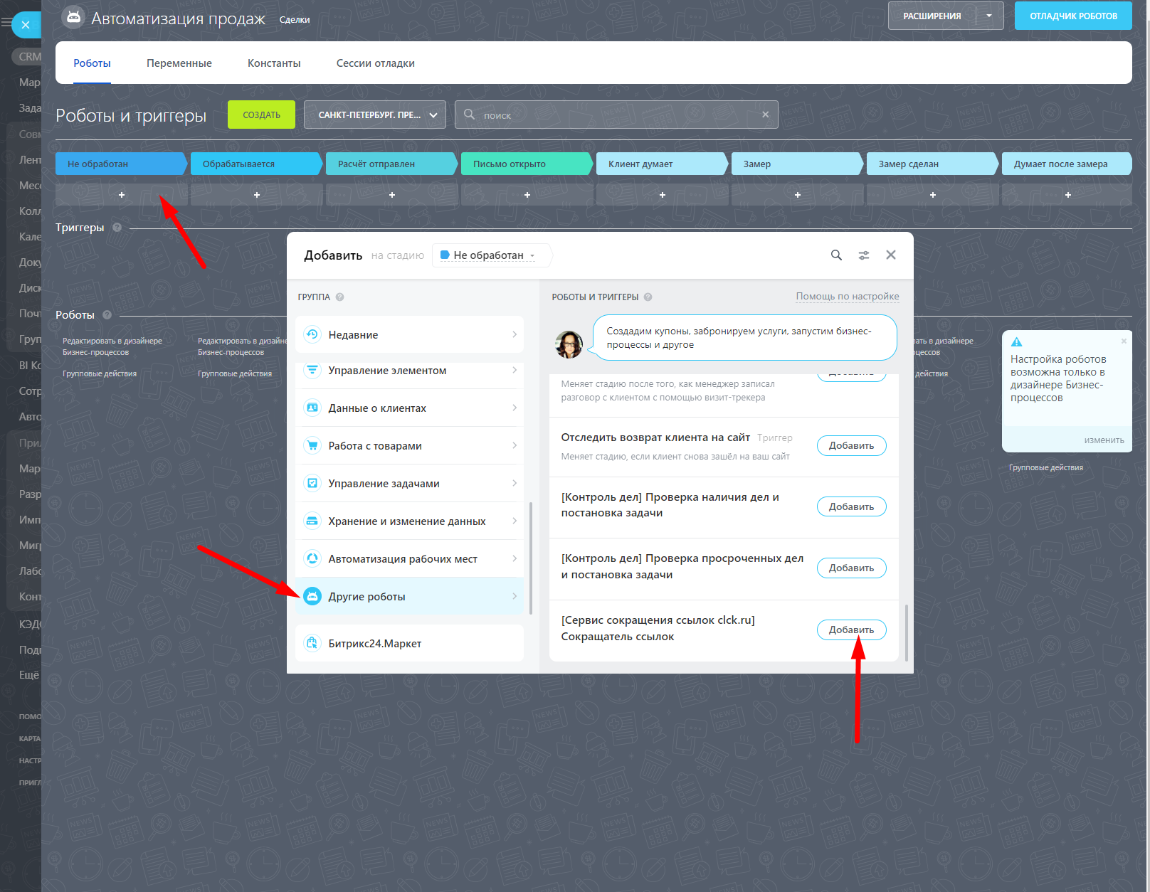 Добавьте робота, которому необходимо передать сокращённую ссылку.