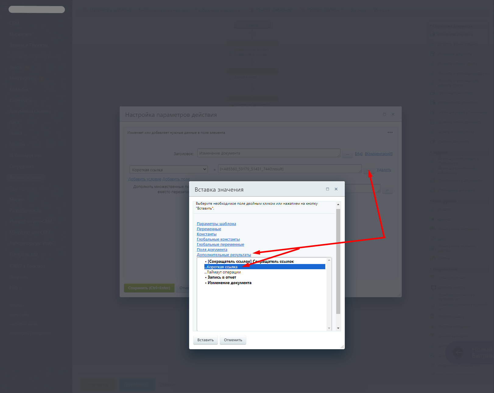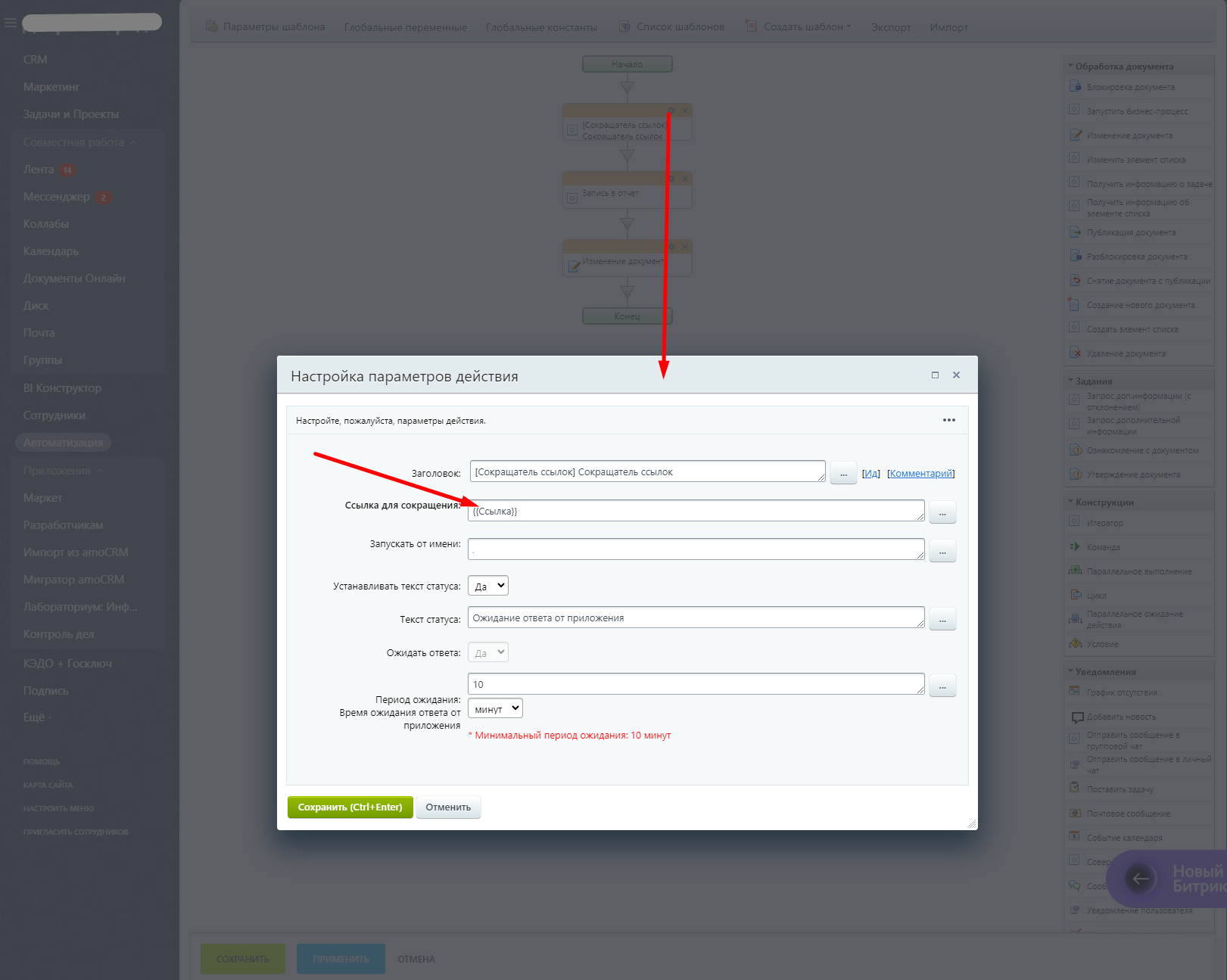 При выполнении такого бизнес-процесса сокращённая ссылка запишется в поле документа.