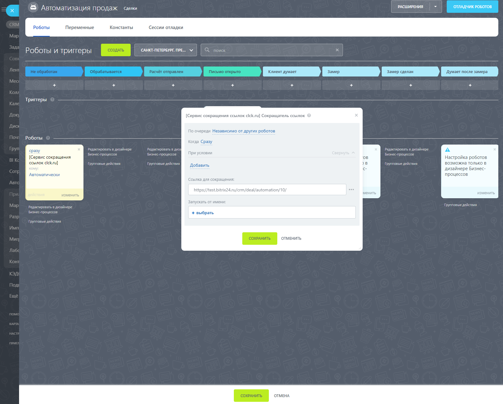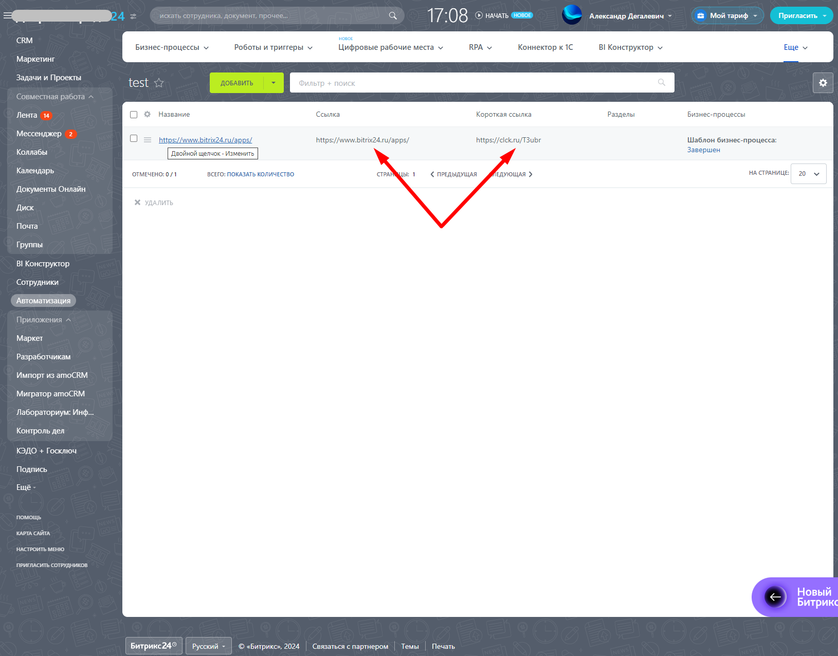 Приложение добавляет на портал робота и активити бизнес-процессов, при помощи которых можно сократить ссылку. Сокращение ссылки происходит через интеграцию с сервисом clck.ru