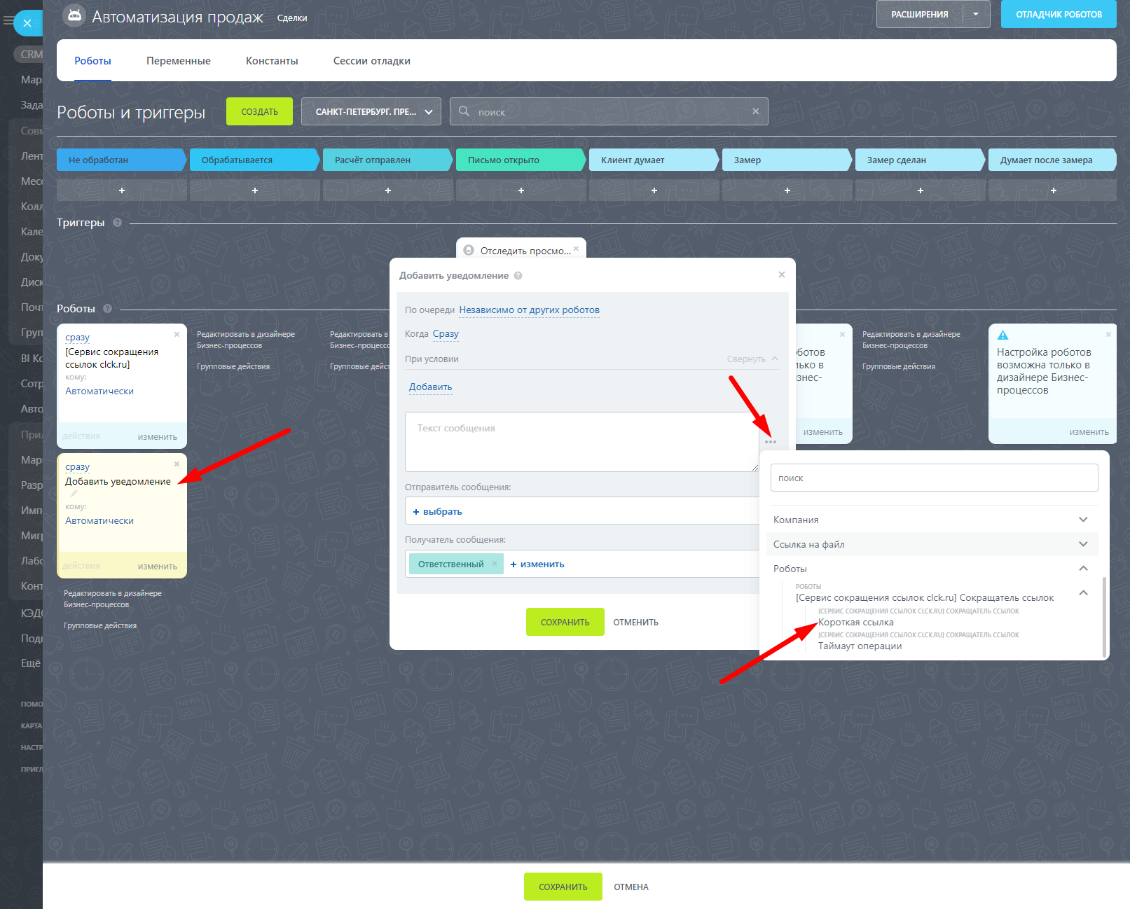 Сокращатель ссылок может пригодиться, если нужно отправить ссылку в уведомлении или смс клиенту или сотруднику.