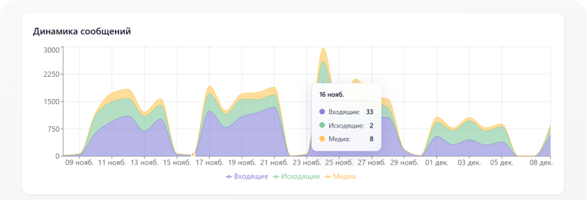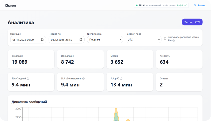- Аналитика: KPI по входящим/исходящим, SLA времени ответа (среднее, p50, p90), разбивка по каналам