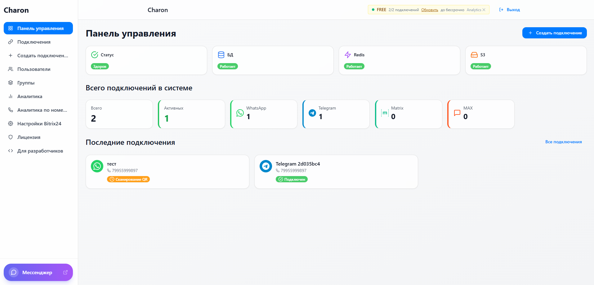 Каждое подключение работает в изолированном процессе — сбой одного мессенджера не влияет на остальные. Автоматический перезапуск при ошибках. Поддержка от 2 до 50+ одновременных подключений на одном сервере.