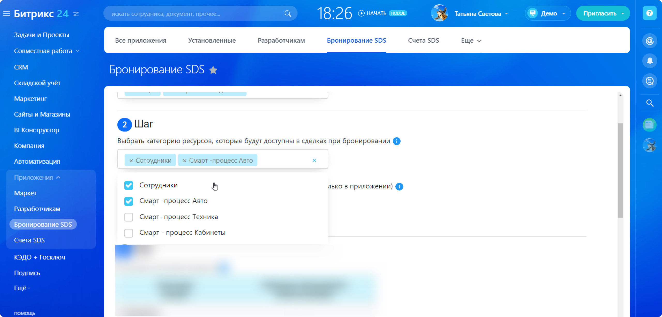 - Бронировать ресурсы, которые настроены в смарт-процессах на вашем портале или которые созданы в самом приложении;