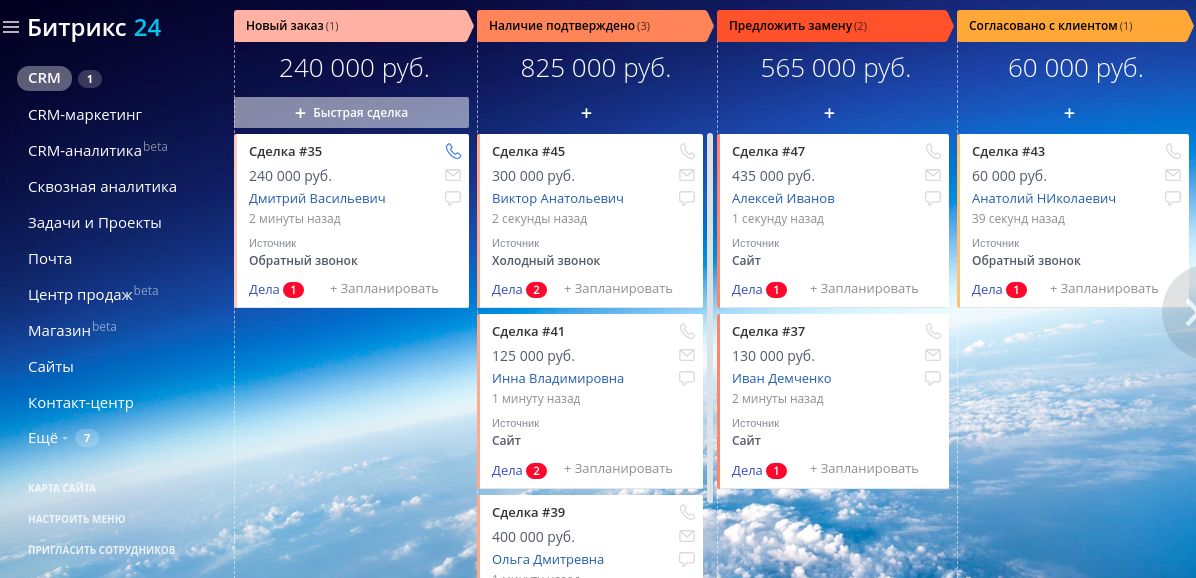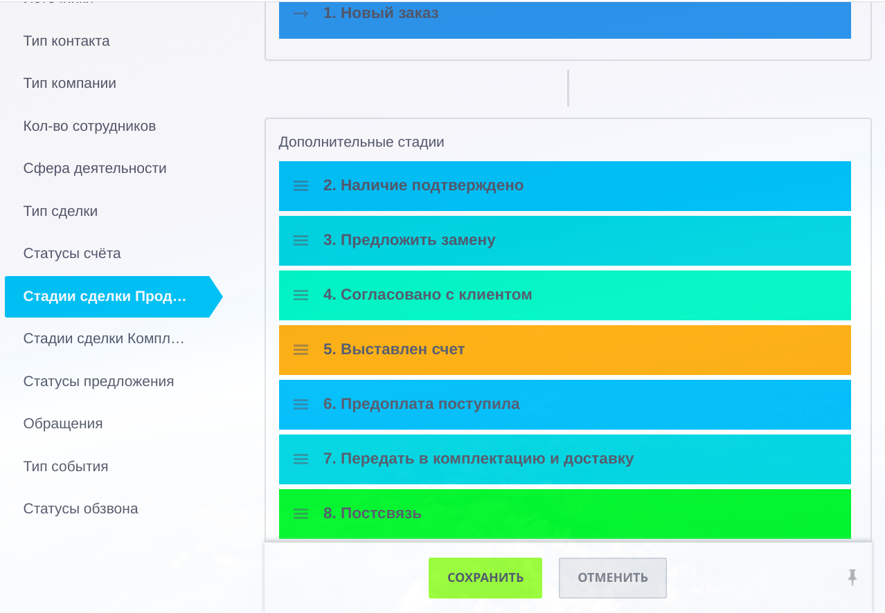 - Стадии воронки лидов и сделок