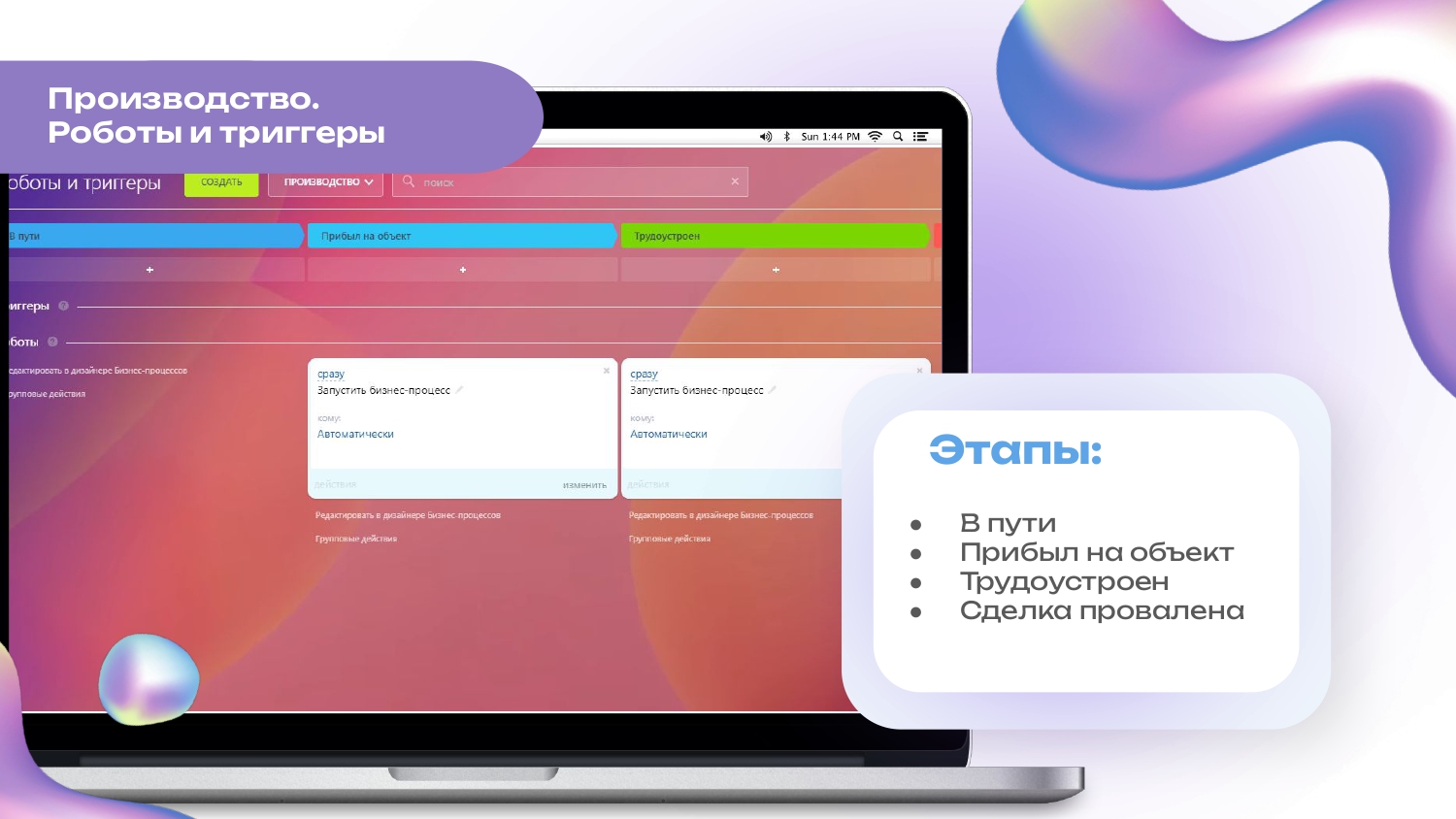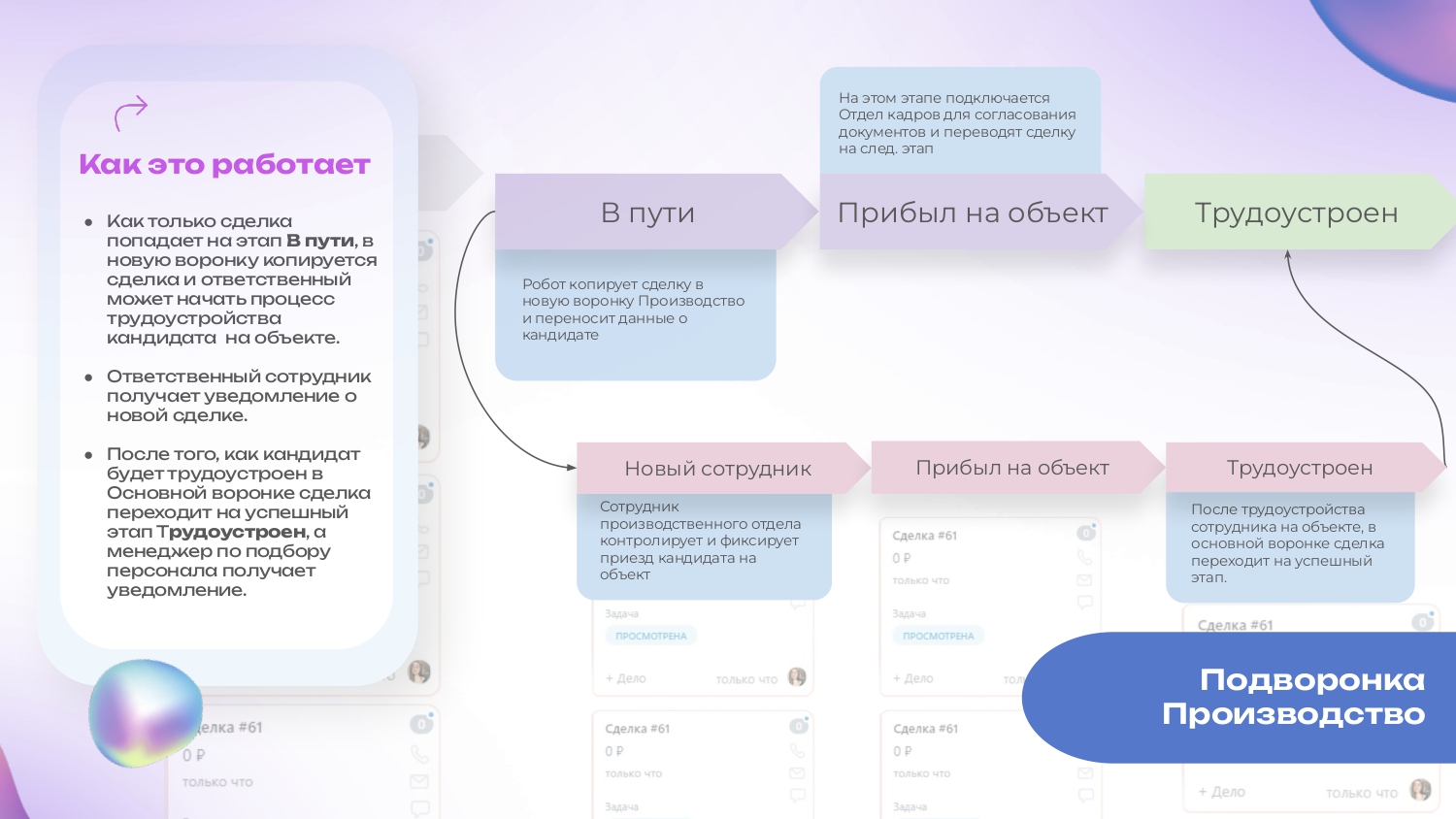 - После того, как трудоустроенный сотрудник отправляется в путь на объект работы, в подворонке для производства появляется новая сделка, которая позволяет контролировать сколько и какие сотрудники прибудет на производство.