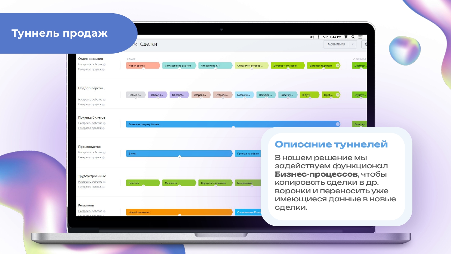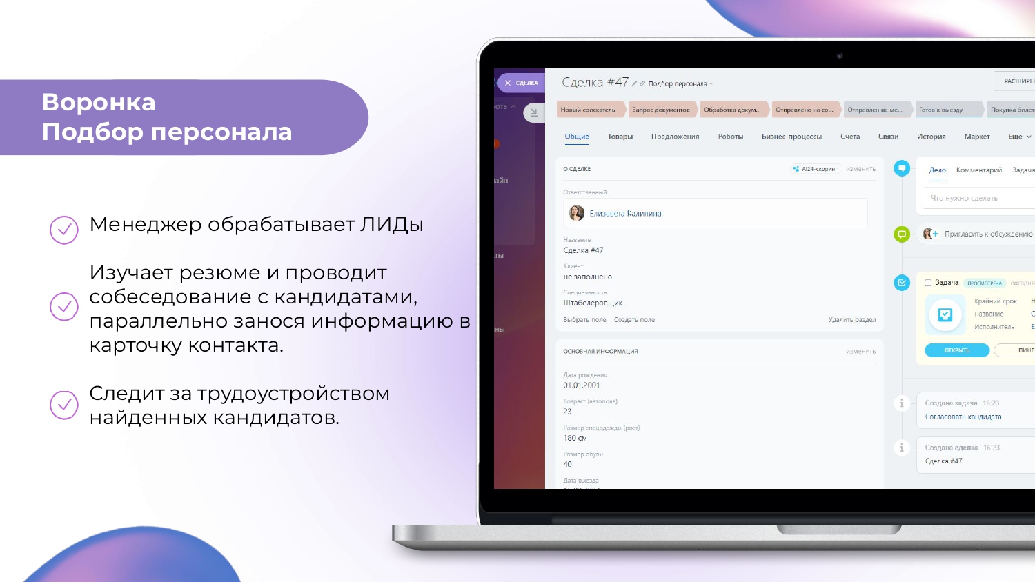 Наш продукт также предлагает задачи и подворонки, которые значительно ускоряют процесс подбора персонала и предотвращают путаницу в сделках среди менеджеров разных отделов. Это помогает создать эффективную и гармоничную рабочую среду, где каждый может сосредоточиться на своих задачах и достичь великих результатов.