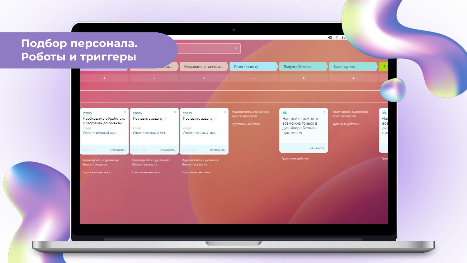 - После того, как билеты куплены, а их сканы прикреплены к сделке, менеджеру приходит уведомление, а сделка автоматические продолжает свое движение по воронке Подбор персонала.