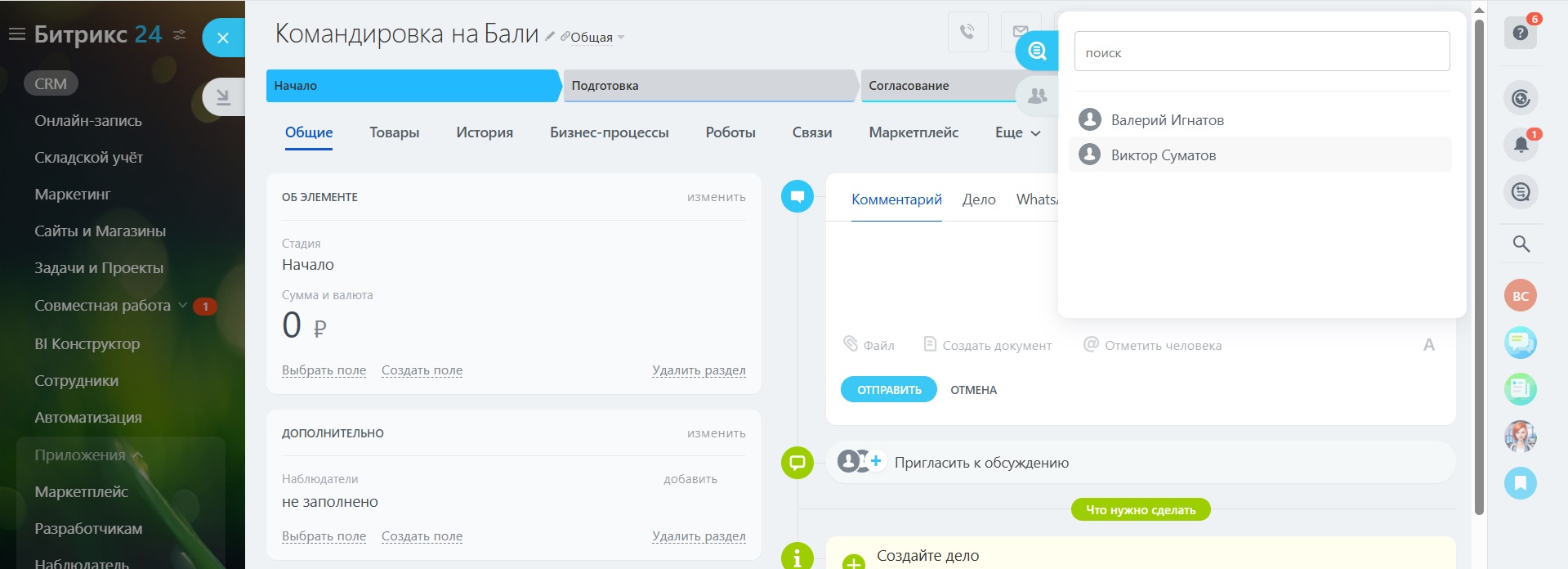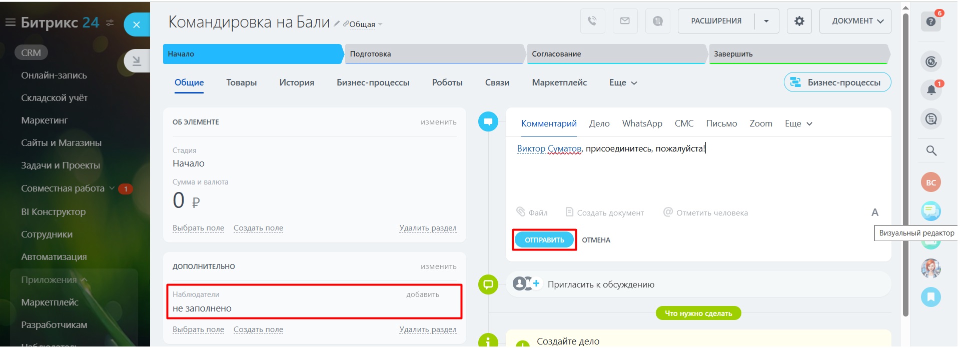 Решение позволяет обрабатывать комментарии пользователями, оставленные в карточке экземпляра смарт-процесса и находить пользователей, которые были отмечены в комментарии. Найденные пользователи добавляются в наблюдатели к экземпляру смарт-процесса и тем самым устраняется необходимость отдельно их приглашать к обсуждению дел в рамках экземпляра смарт-процесса.