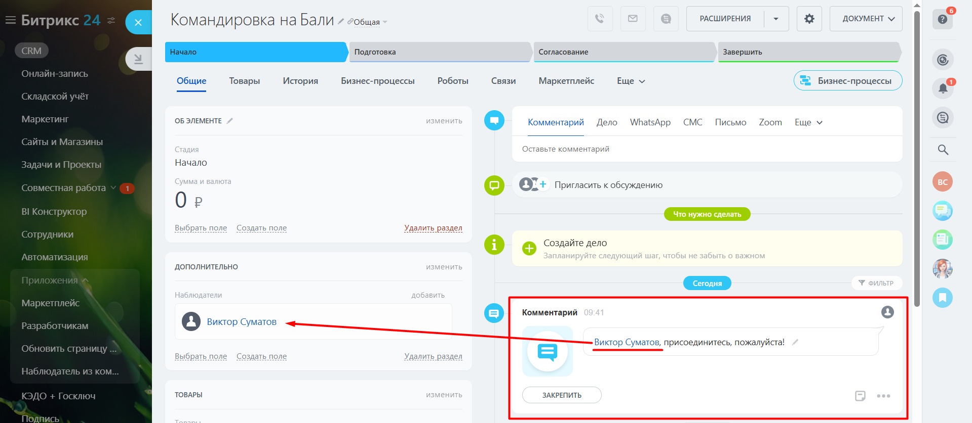 Комментарий с отмеченными пользователями как и всегда попадает в ленту карточки экземпляра смарт-процесса.