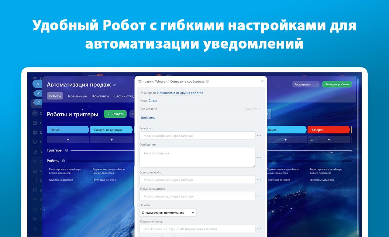 Автоматизируйте отравку уведомлений клиентам через Telegram с помощью Роботов, Триггеров и Бизнес-процессов, чтобы ваши менеджеры не занимались рутиной, а клиенты всегда были в курсе этапов Сделки