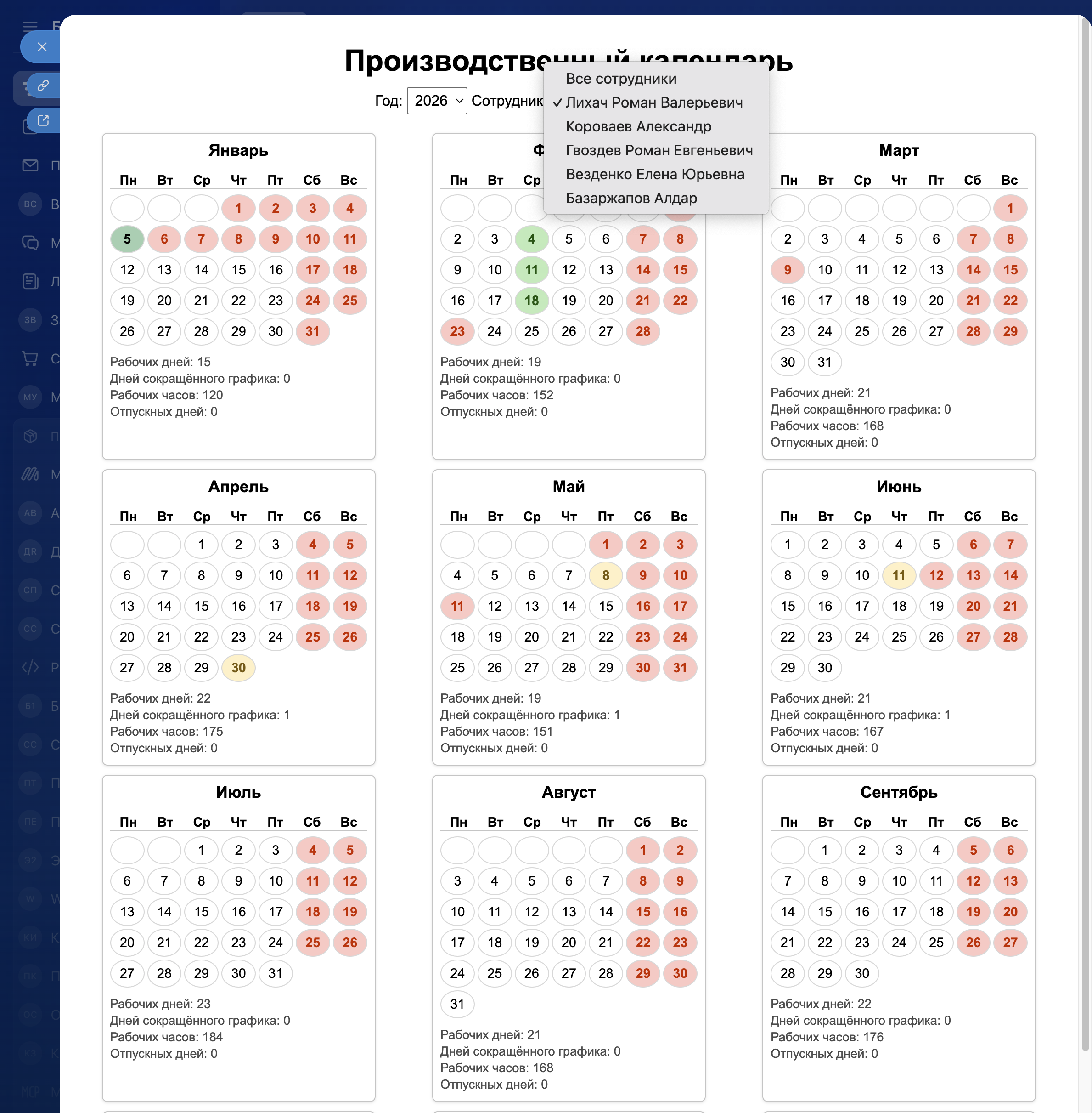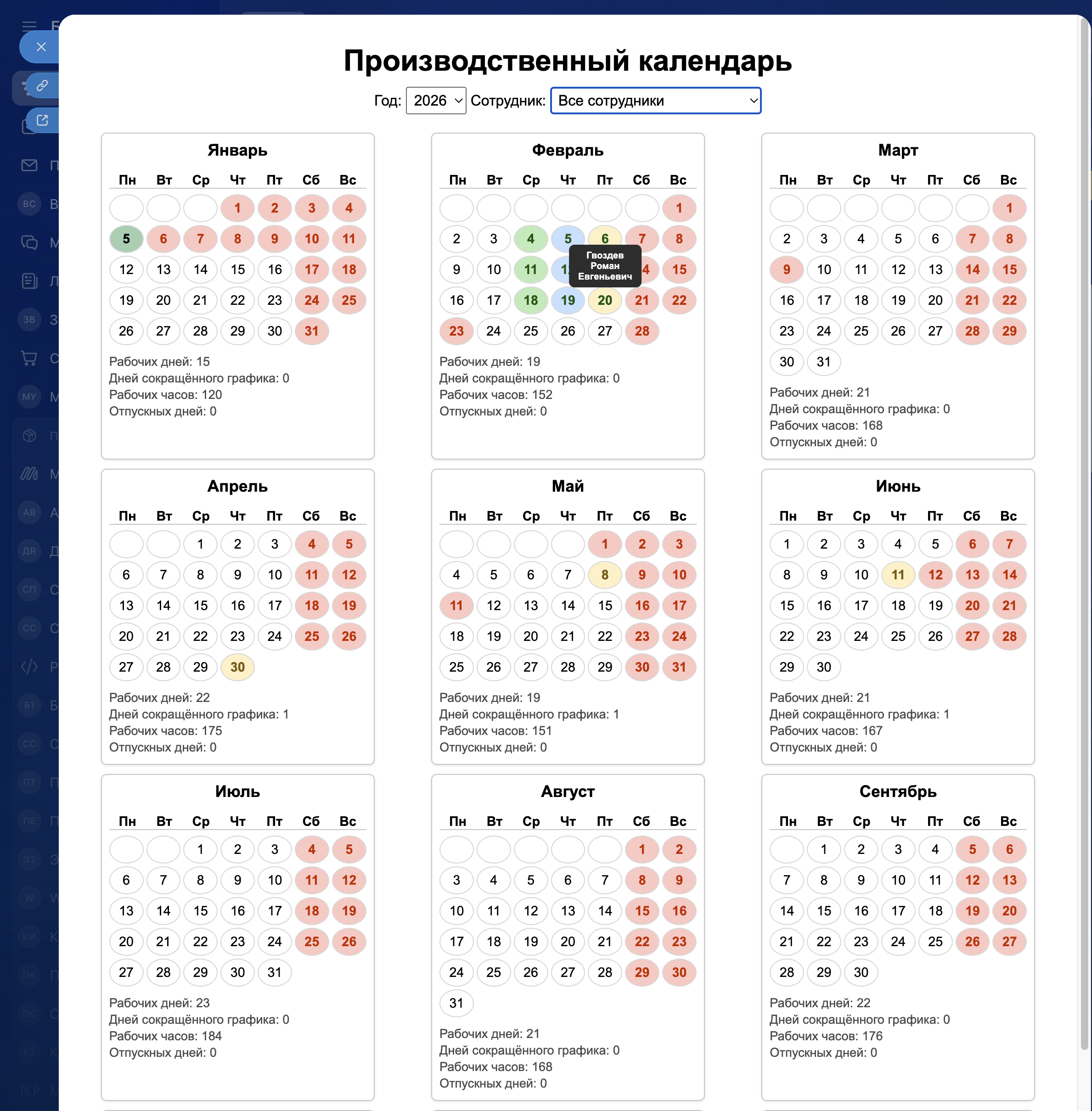 Производственный календарь — умное решение для кадровиков, планировщиков и руководителей, которое автоматизирует учёт рабочих и выходных дней с учётом законодательства РФ и индивидуальных отпусков сотрудников.