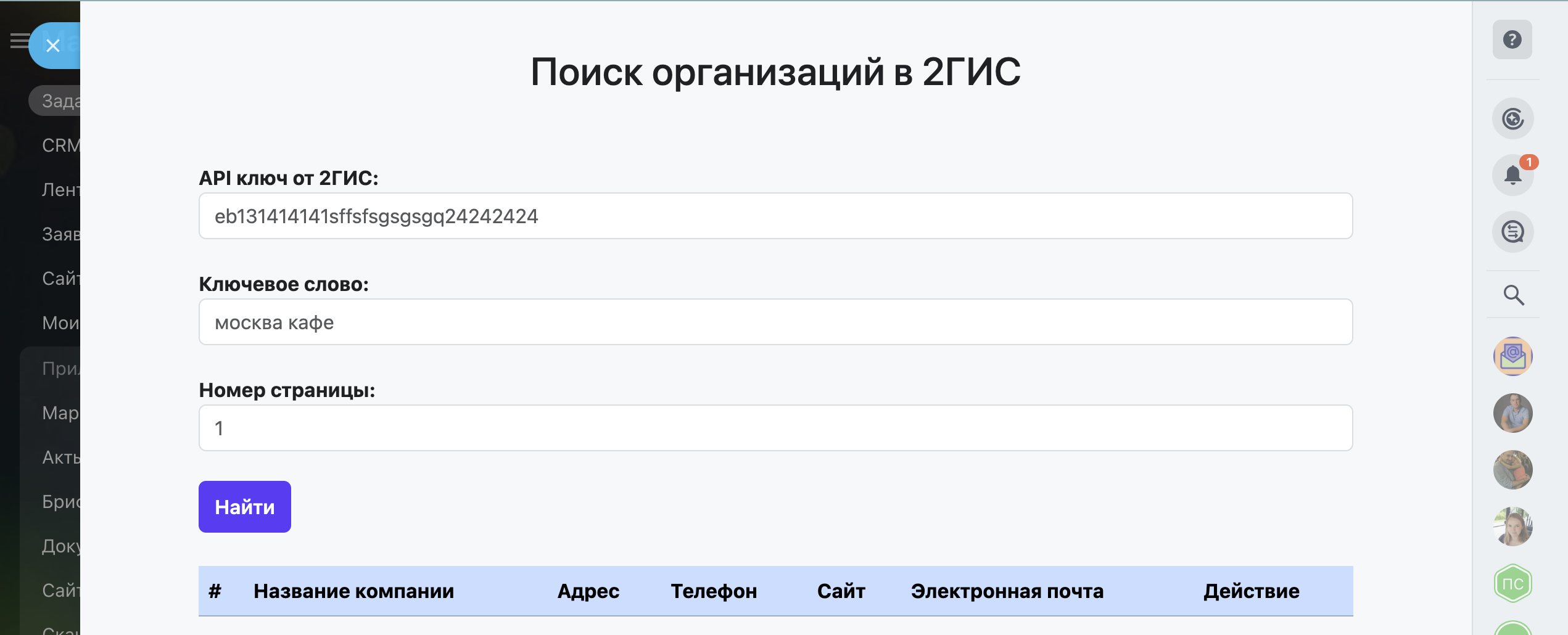 Увеличьте клиентскую базу вашей компании с помощью нашего инновационного приложения для экспорта данных из 2ГИС! Специально разработанное для бизнеса, наше приложение позволяет легко находить и экспортировать информацию об организациях прямо в ваш Битрикс24, в раздел "Компании".