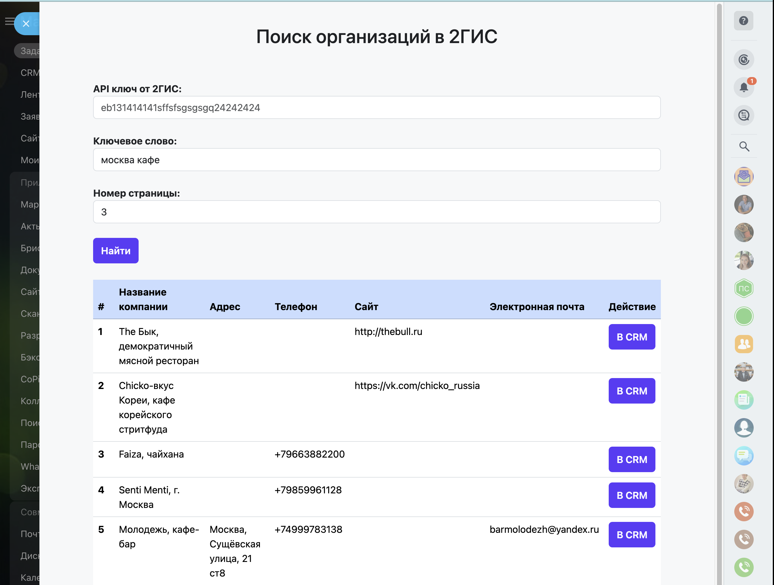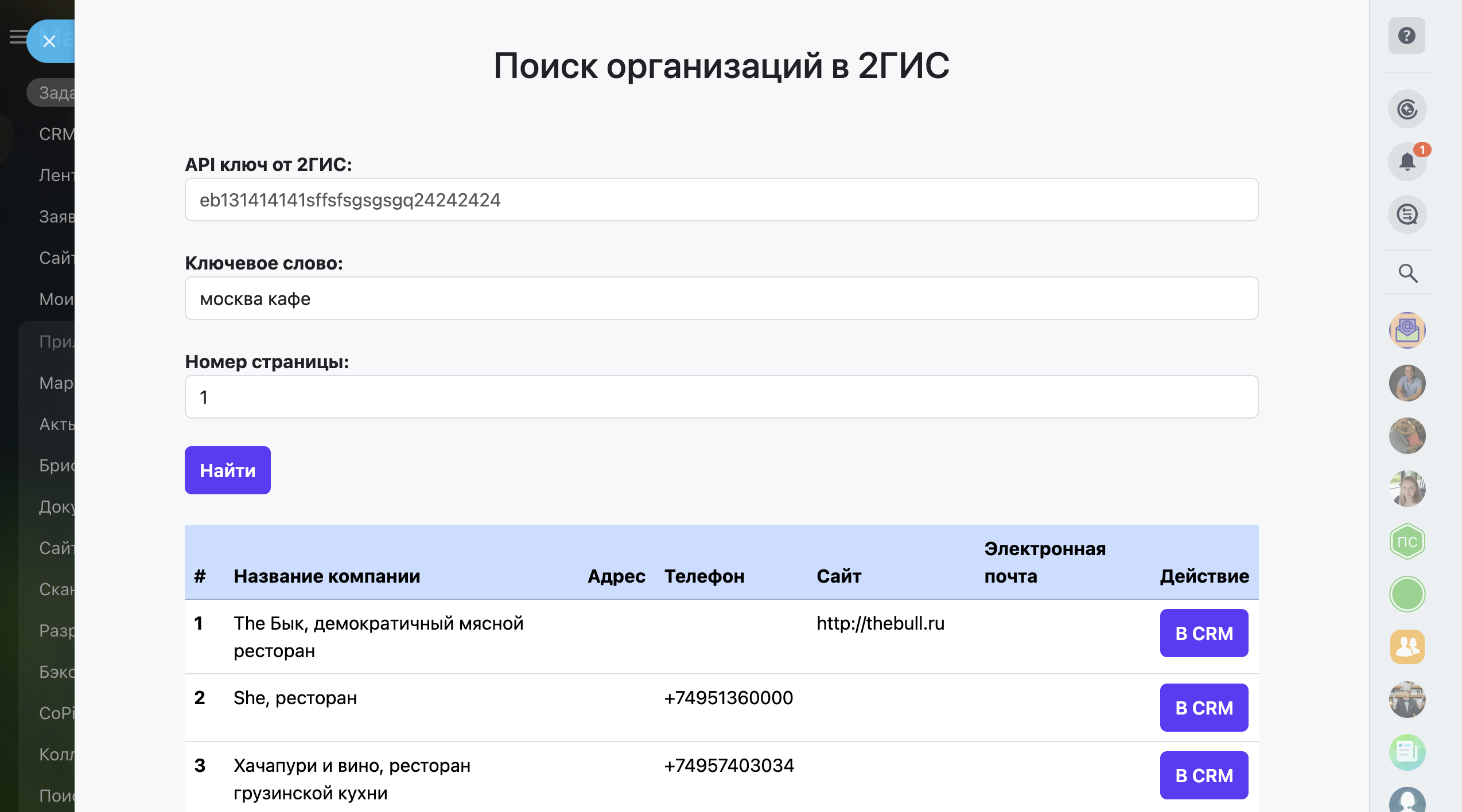 - Экспорт в один клик: Экспортируйте данные об организациях в Битрикс24 без лишних усилий.