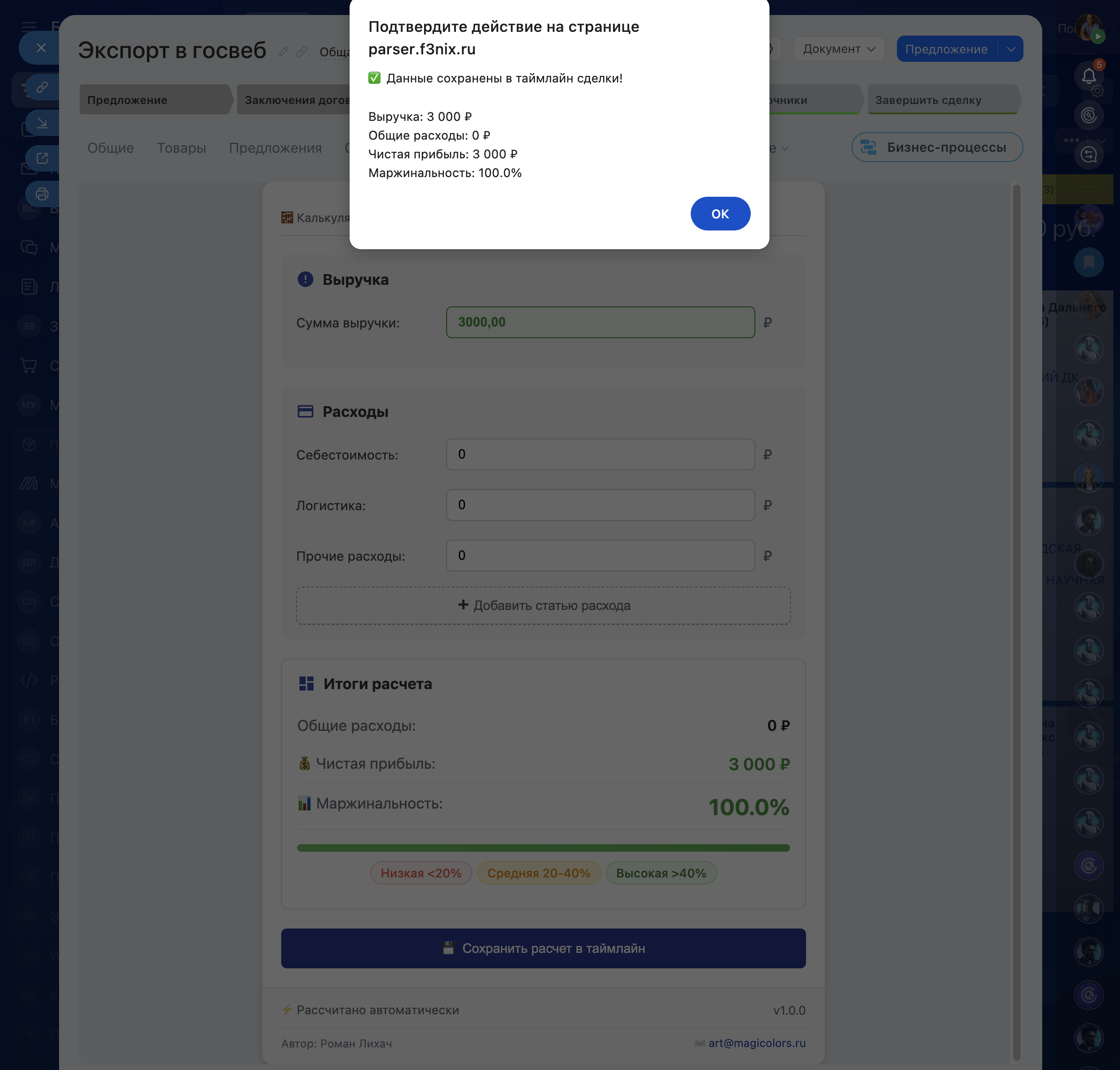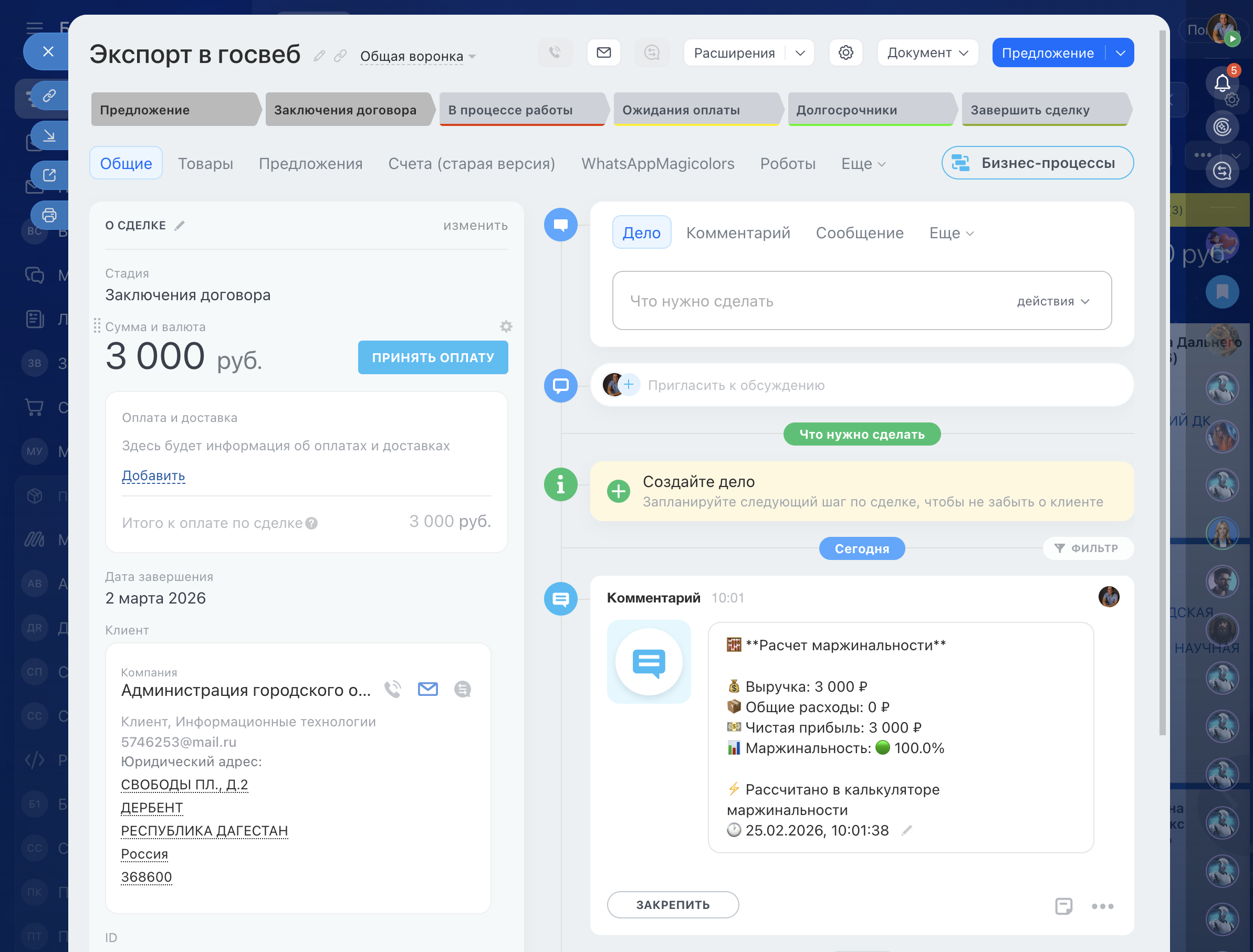 Больше не тратите время на ручные расчёты в Excel. Калькулятор маржинальности автоматизирует анализ рентабельности, помогает избегать убыточных сделок, оптимизировать цены и принимать решения на основе данных, а не догадок. Главная особенность — все результаты автоматически сохраняются в таймлайне сделки, чтобы вы всегда видели историю расчётов, изменения маржи и динамику прибыльности прямо в рамках рабочего процесса.
