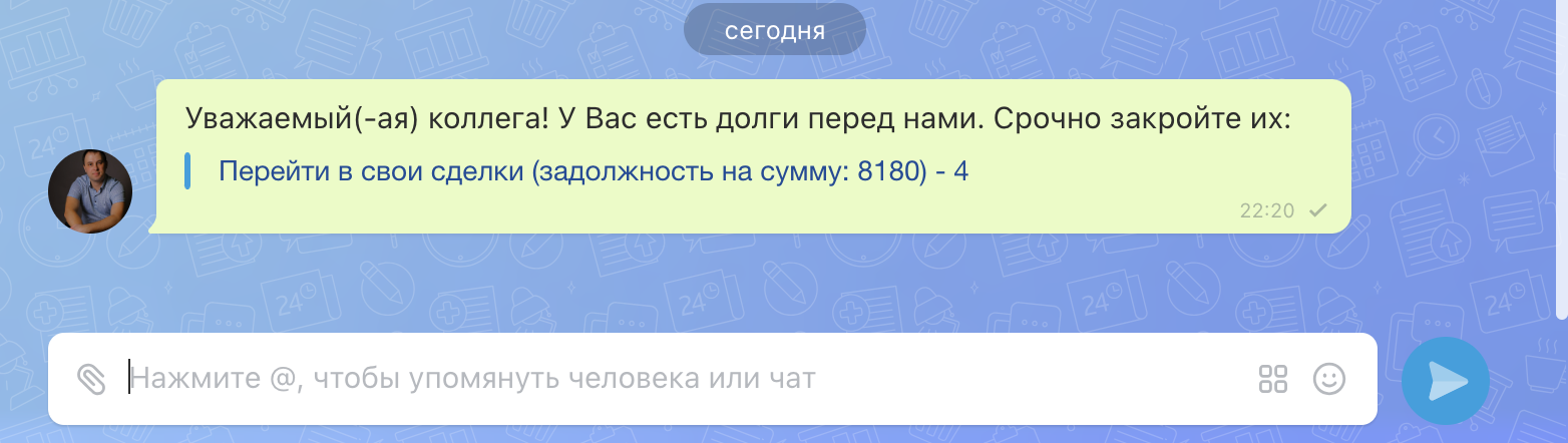 - Общая картина задолженностей — всегда на виду, какие задачи или сделки не выполнены, кто отвечает за них.