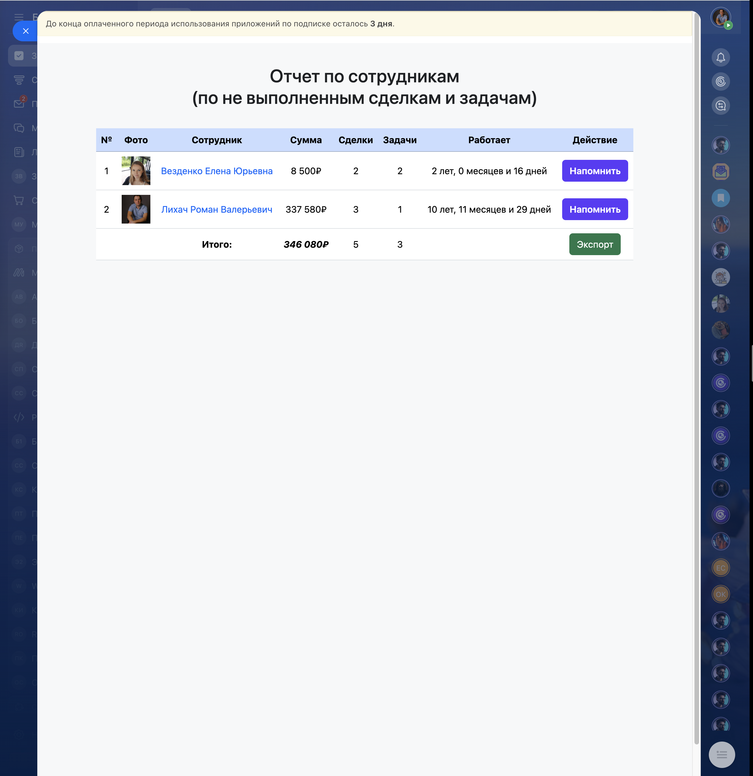Приложение "Отчет по сотрудникам" — это инструмент, разработанный специально для руководителей и начальников, чтобы упростить управление командой и обеспечить полный контроль над выполнением задач и сделок.