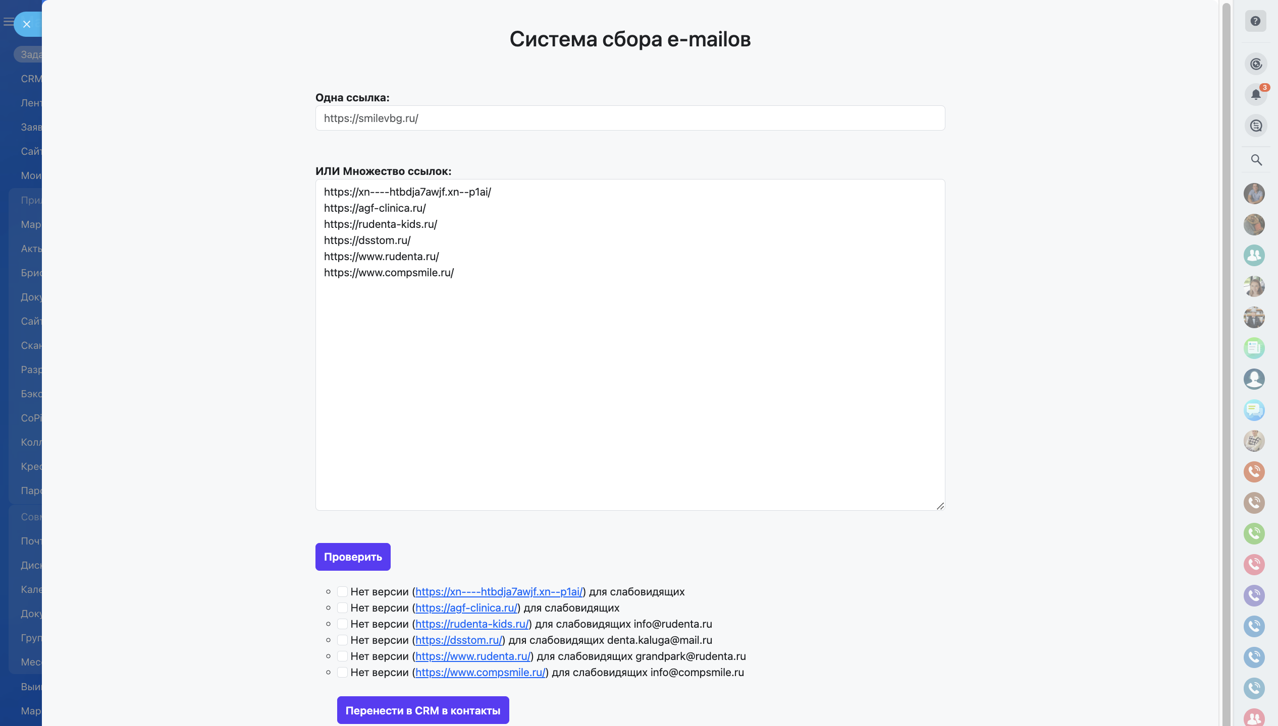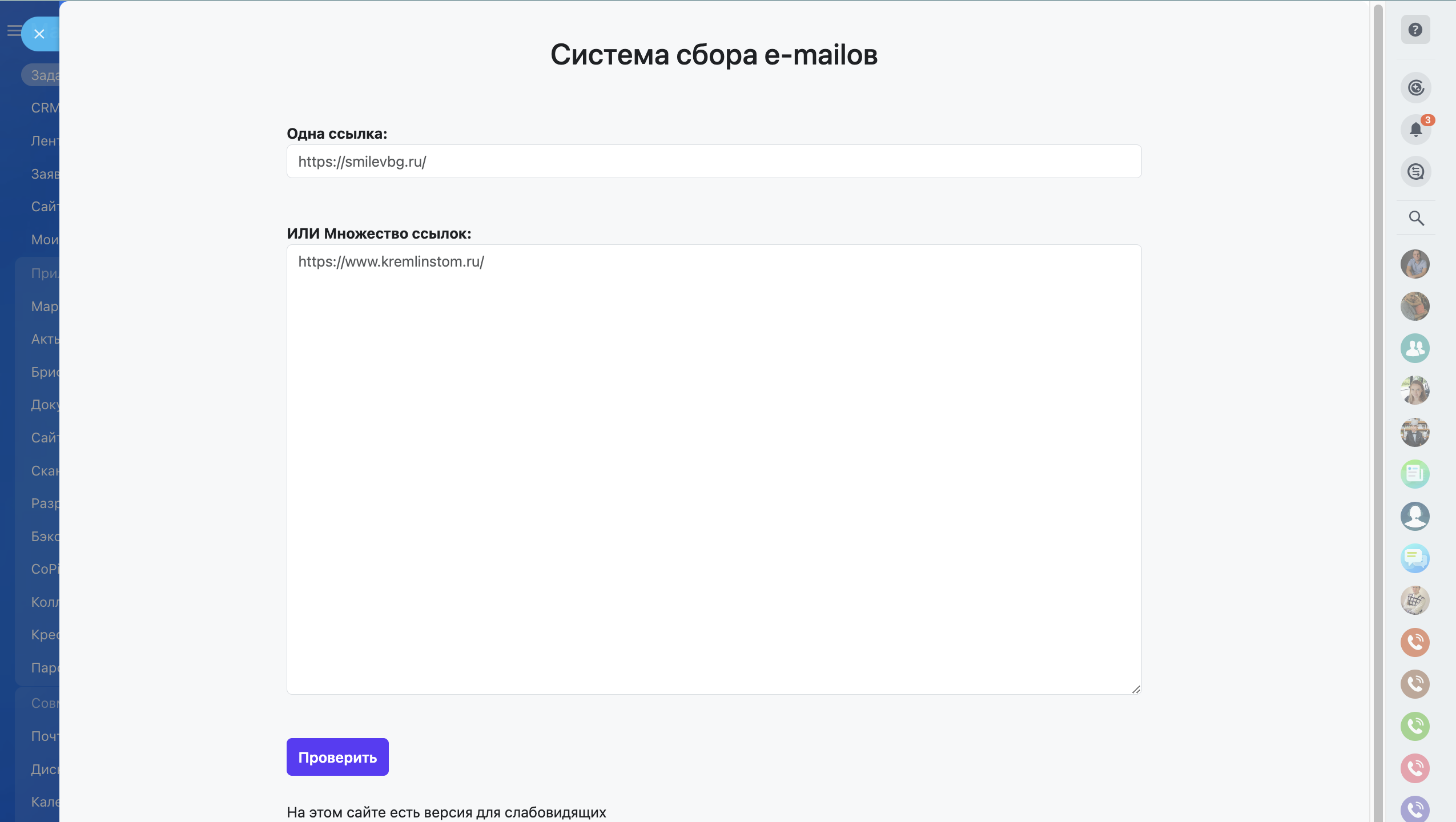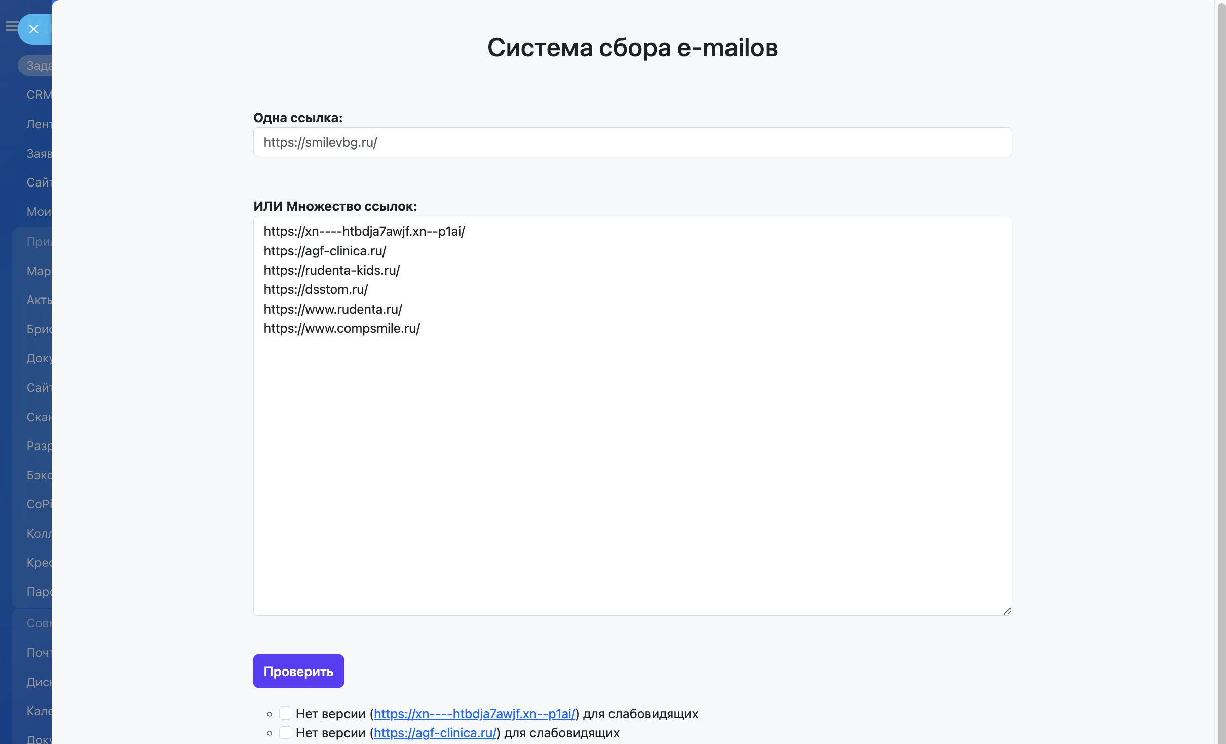 Парсер e-mail с сайтов и проверка на присутствие версии для слабовидящих.