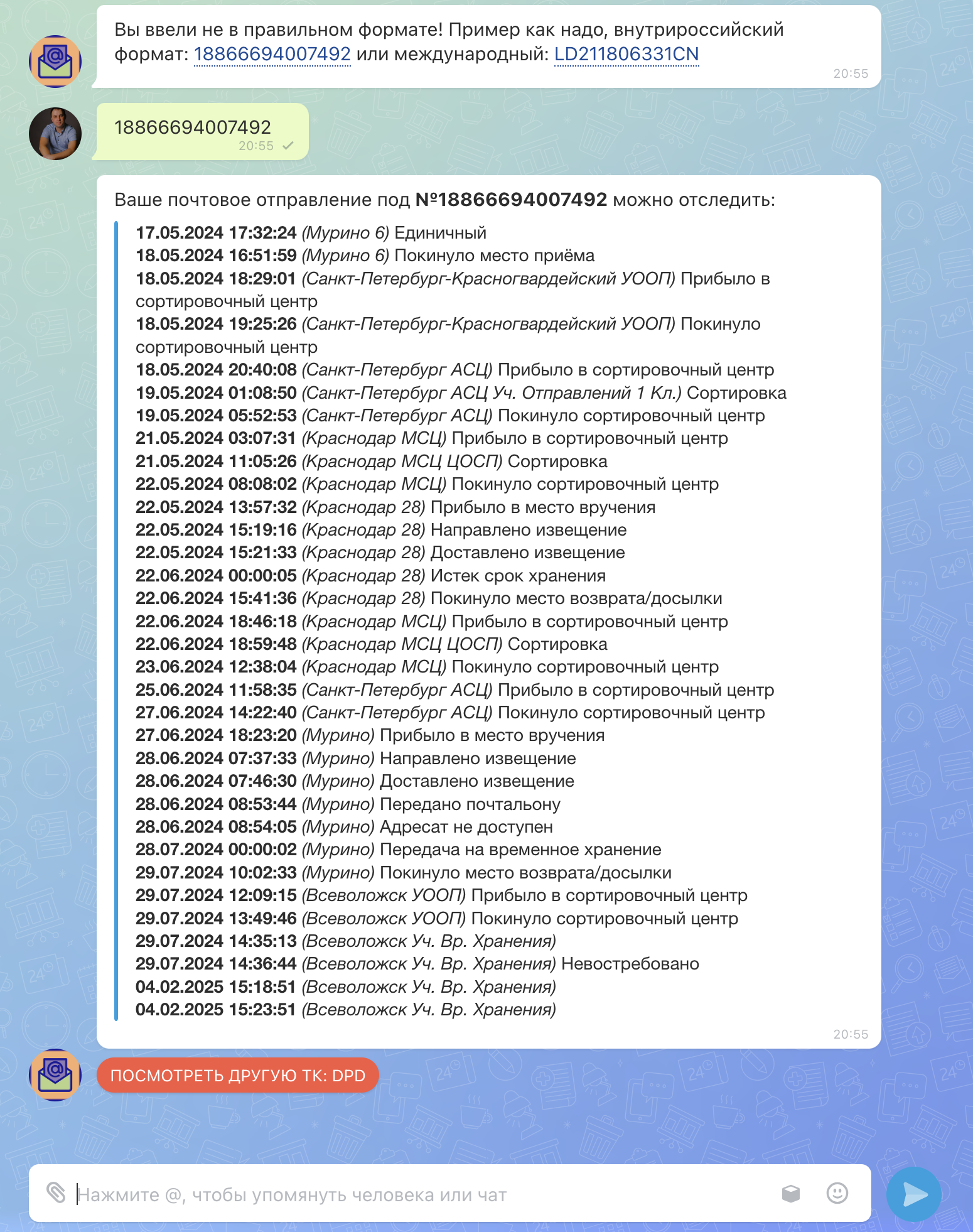 Для этого сразу после установки бота вас будет приветствовать бот с подсказкой, где просто нужно ввести трек-номер вашей доставки, отправить этот номер в чат, и он вам выдаст полностью путь вашей посылки или письма. А также есть возможность отследить в другой ТК DPD по нажатию на красную кнопку.
