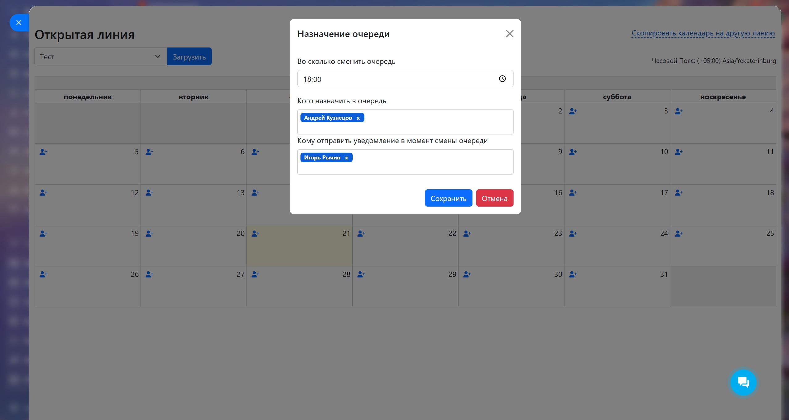 - Автоматическая смена очереди: настройте расписание, чтобы сотрудники автоматически назначались на открытые линии в заданные дни и часы.