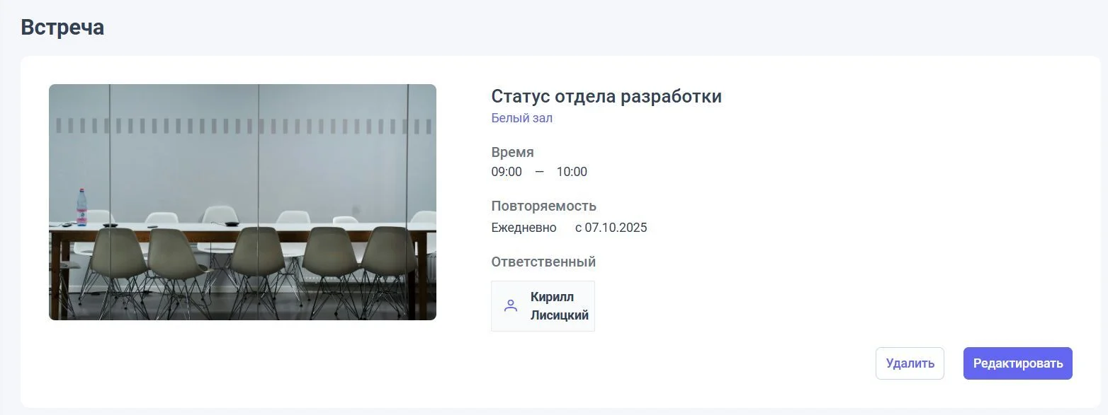 Будет создана карточка встречи, которую можно отредактировать при необходимости — заменить время или зал, добавить участников и прочее.