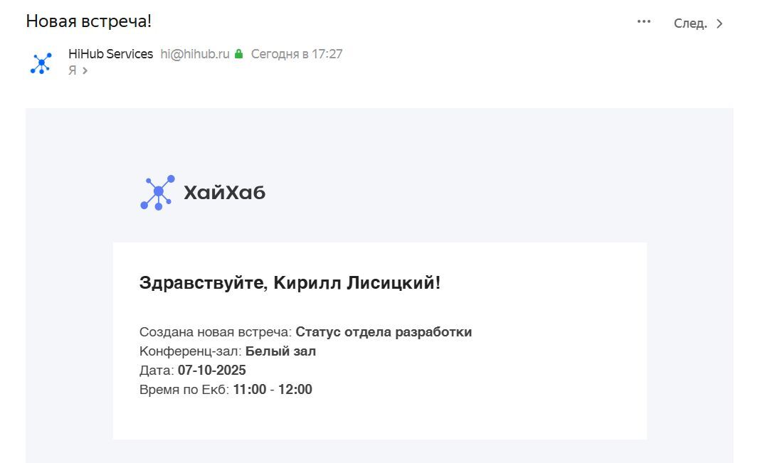 Все указанные на встрече сотрудники получат уведомления о предстоящей встрече на корпоративные почты, с которых они зарегистрированы в системе.