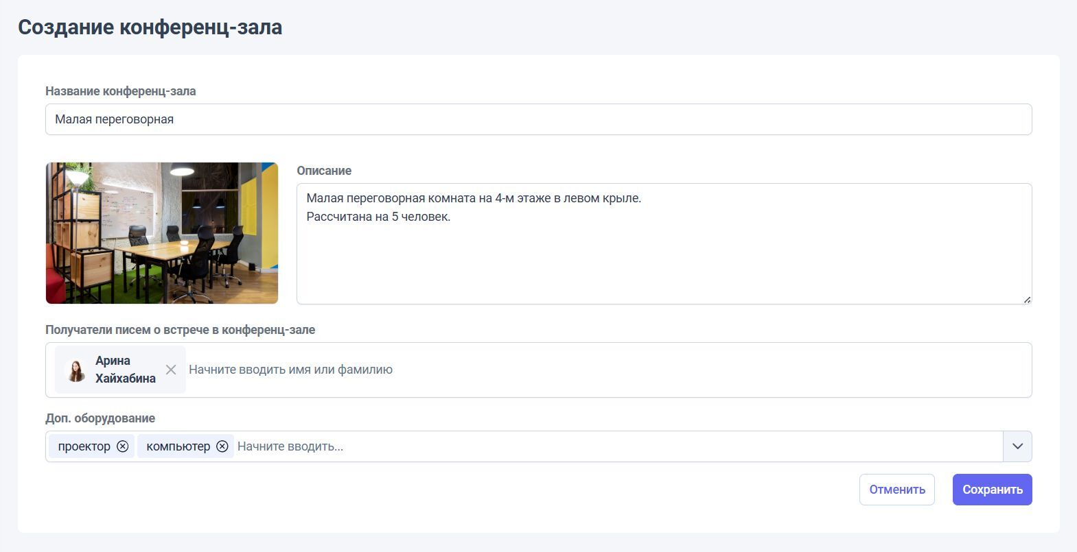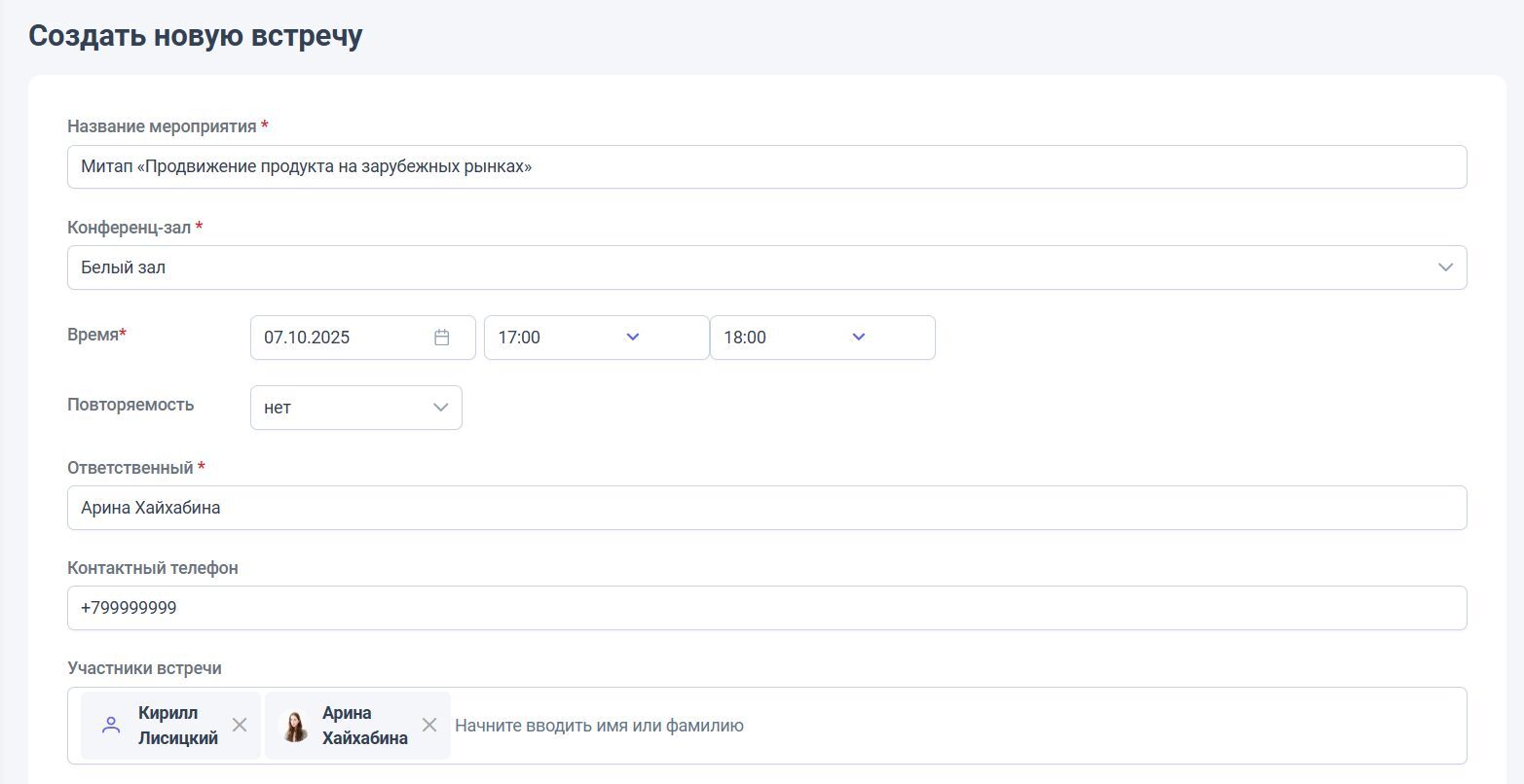 При создании встречи можно указать конференц-зал, тему встречи, время и повторяемость, приглашенных сотрудников.